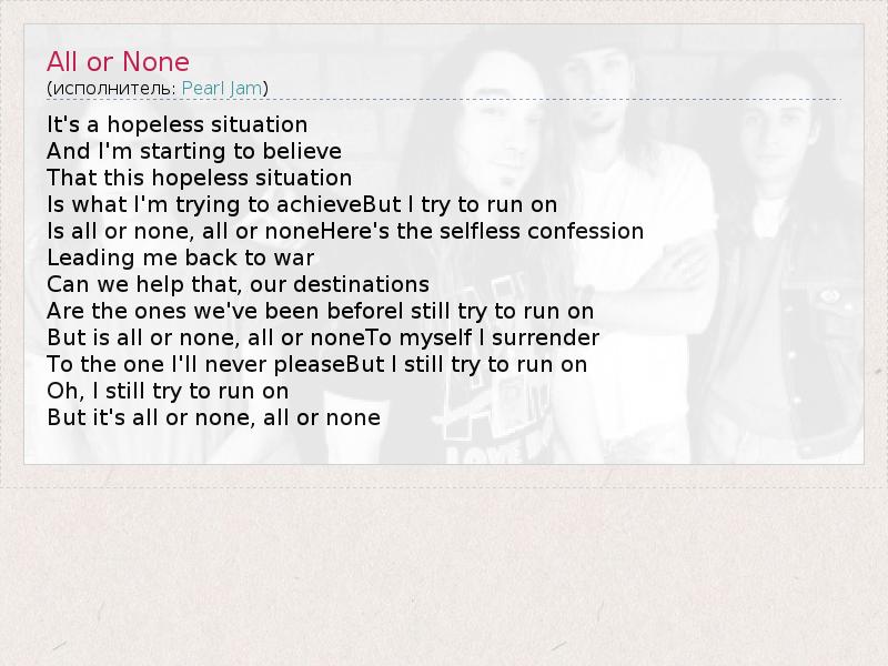 Это интересно:Одна из четырех главных групп (наряду с Nirvana, Soundgarden и Alice in Chains) музыкального движения гранж, пользовавшегося большой популярностью в первой половине 1990-х годов. Более того, и в XXI веке Pearl Jam пока не торопятся завязывать с музыкой – несмотря на то, что их новые работы не достигают того же уровня популярности, что был у их первых альбомов... продолжение