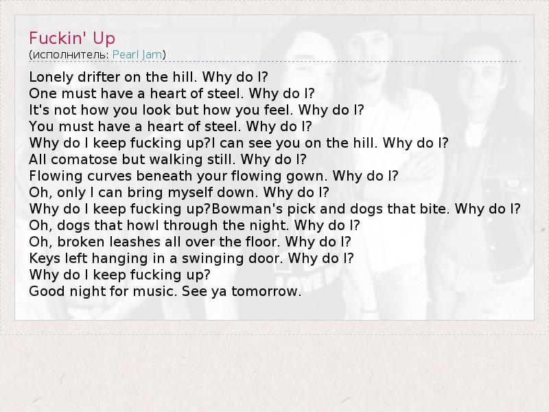 Lonely drifter on the hill. Why do I? One must have a heart of steel. Why do I? It's not how you look but how you feel. Why do I? You must have a heart of steel. Why do I? Why do I keep fucking up?I can see you on the hill. Why do I? All comatose but walking still. Why do I? Flowing curves beneath your flowing gown. Why do I? Oh, only I can bring myself down. Why do I? Why do I keep fucking up?Bowman's pick and dogs that bite. Why do I? Oh, dogs that howl through the night. Why do I? Oh, broken leashes all over the floor. Why do I? Keys left hanging in a swinging door. Why do I? Why do I keep fucking up? Good night for music. See ya tomorrow.