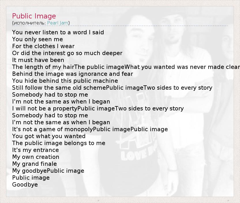 Это интересно:Одна из четырех главных групп (наряду с Nirvana, Soundgarden и Alice in Chains) музыкального движения гранж, пользовавшегося большой популярностью в первой половине 1990-х годов. Более того, и в XXI веке Pearl Jam пока не торопятся завязывать с музыкой – несмотря на то, что их новые работы не достигают того же уровня популярности, что был у их первых альбомов... продолжение