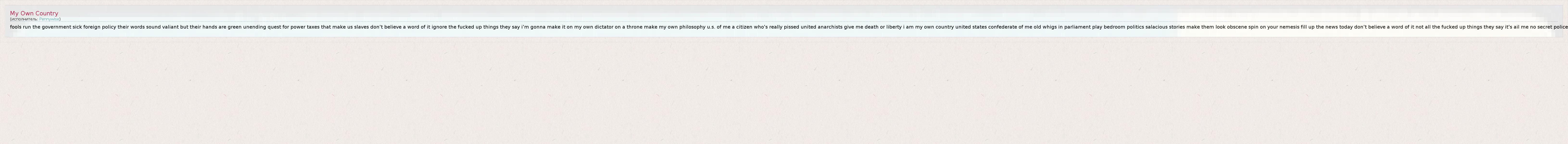 fools run the government sick foreign policy their words sound valiant but their hands are green unending quest for power taxes that make us slaves don't believe a word of it ignore the fucked up things they say i'm gonna make it on my own dictator on a throne make my own philosophy u.s. of me a citizen who's really pissed united anarchists give me death or liberty i am my own country united states confederate of me old whigs in parliament play bedroom politics salacious stories make them look obscene spin on your nemesis fill up the news today don't believe a word of it not all the fucked up things they say it's ail me no secret police