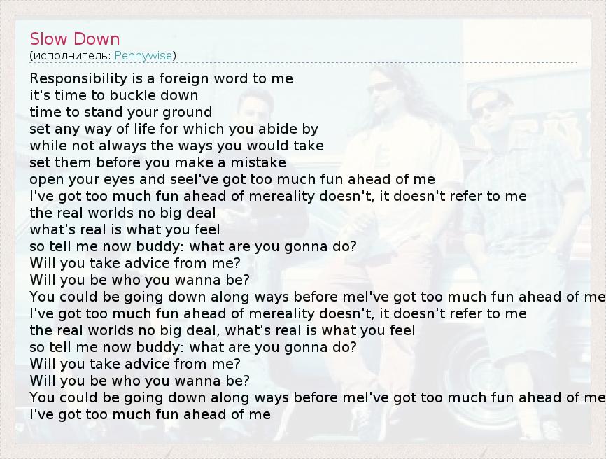Responsibility is a foreign word to me it's time to buckle down time to stand your ground set any way of life for which you abide by while not always the ways you would take set them before you make a mistake open your eyes and seeI've got too much fun ahead of me I've got too much fun ahead of mereality doesn't, it doesn't refer to me the real worlds no big deal what's real is what you feel so tell me now buddy: what are you gonna do? Will you take advice from me? Will you be who you wanna be? You could be going down along ways before meI've got too much fun ahead of me I've got too much fun ahead of mereality doesn't, it doesn't refer to me the real worlds no big deal, what's real is what you feel so tell me now buddy: what are you gonna do? Will you take advice from me? Will you be who you wanna be? You could be going down along ways before meI've got too much fun ahead of me I've got too much fun ahead of me