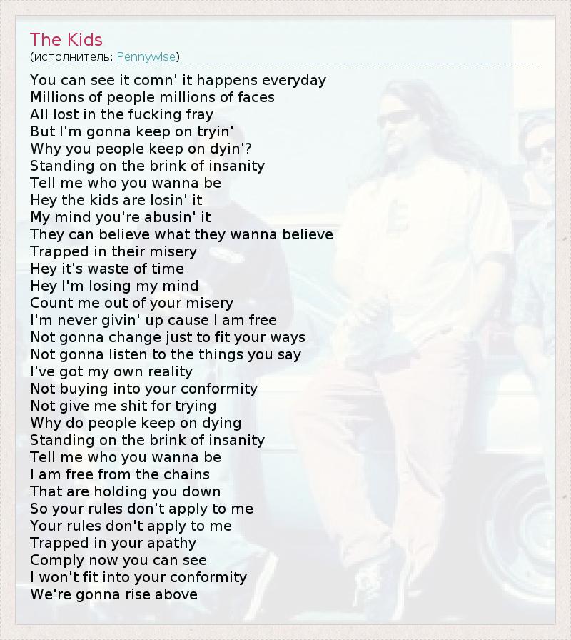 Это интересно:С 1987 года вокалист Jim Lindberg, басист Jason Thirsk, ударник Byron McMackin и гитарист Fletcher Dragge старательно пытались пролезть на панк-роковую стезю. В Калифорнии с этим бывает немного проблем - и уже в 1989 году Pennywise (чье название произошло благодаря одному из героев романа Стивена Кинга "Оно") записывали свои первые песни, из которых был составлен мини-альбом ‘A Word From The Wise'.... продолжение