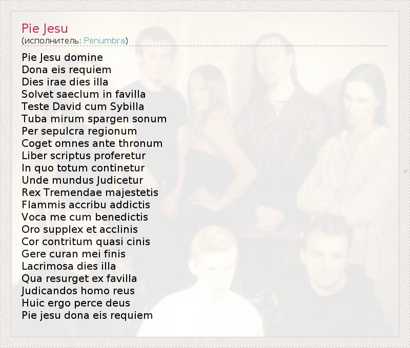 Pie Jesu domine Dona eis requiem Dies irae dies illa Solvet saeclum in favilla Teste David cum Sybilla Tuba mirum spargen sonum Per sepulcra regionum Coget omnes ante thronum Liber scriptus proferetur In quo totum continetur Unde mundus Judicetur Rex Tremendae majestetis Flammis accribu addictis Voca me cum benedictis Oro supplex et acclinis Cor contritum quasi cinis Gere curan mei finis Lacrimosa dies illa Qua resurget ex favilla Judicandos homo reus Huic ergo perce deus Pie jesu dona eis requiem