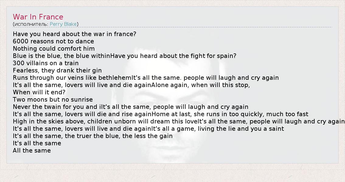 Это интересно:Ирландский певец и композитор Perry Blake родился 10 мая 1970 года. Дебютный альбом 1998 получил высокую оценку в Англии. Сотрудничал с Françoise Hardy, André Schneider и Émilie Simon. Дискография:"Parry Blake" - 1998"Still life" - 1999"Presque rien" - 2000 (soundtrack)"Broken statues" - 2001(live)"California" - 2002"Song for someone" - 2004"The crying room" - 2006"Canyon songs" - 2007