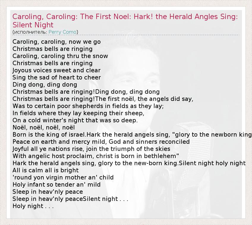 ГлавнаяИсполнителиPerry ComoCaroling, Caroling: The First Noel: Hark! the Herald Angles Sing: Silent Night