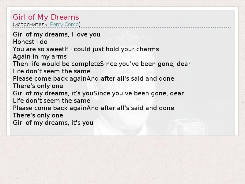А как ты думаешь, о чем песня "Girl of My Dreams" ?