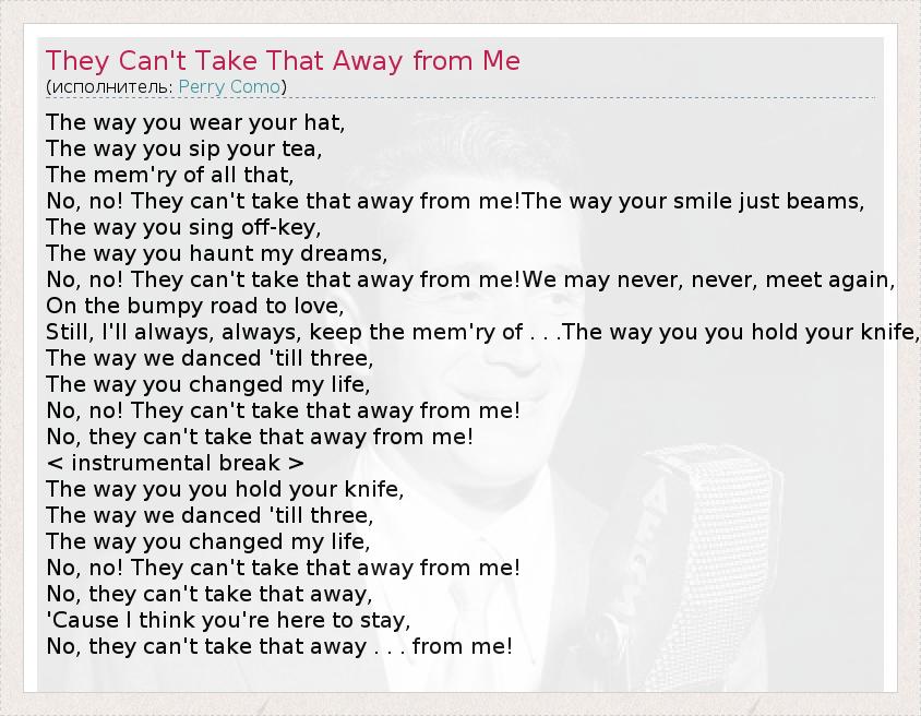 А как ты думаешь, о чем песня "They Can't Take That Away from Me" ?