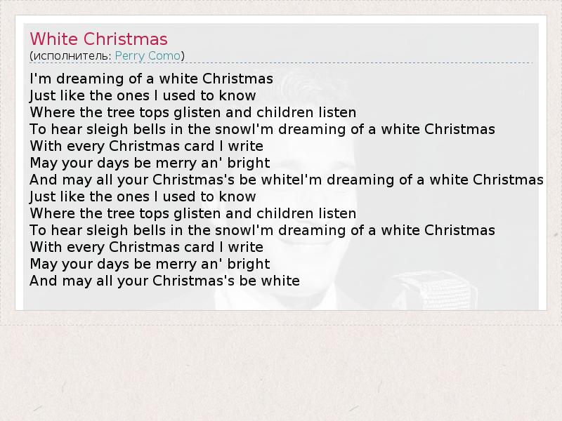 I'm dreaming of a white Christmas Just like the ones I used to know Where the tree tops glisten and children listen To hear sleigh bells in the snowI'm dreaming of a white Christmas With every Christmas card I write May your days be merry an' bright And may all your Christmas's be whiteI'm dreaming of a white Christmas Just like the ones I used to know Where the tree tops glisten and children listen To hear sleigh bells in the snowI'm dreaming of a white Christmas With every Christmas card I write May your days be merry an' bright And may all your Christmas's be white