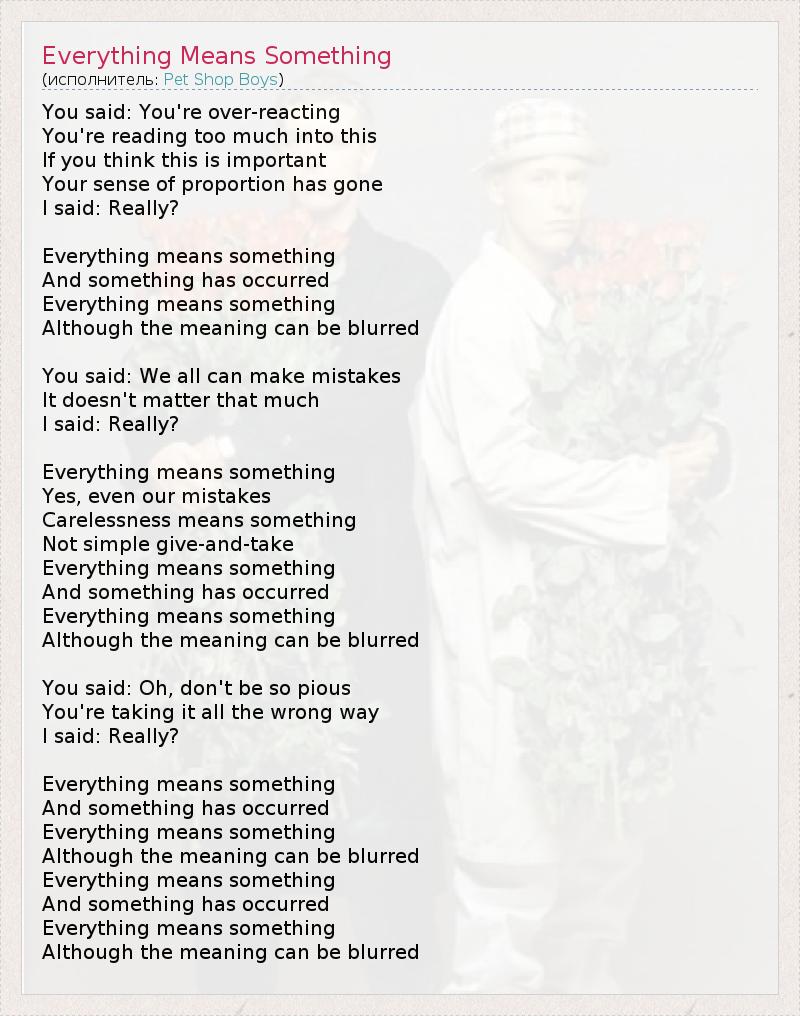 Ты сказал: "Ты слишком остро реагируешь, Обнаруживаешь в этом то, чего нет. Если считаешь, что это важно, То ты утратил чувство меры". Я ответил: "Неужели?" Всё что-то означает, И это что-то произошло. Всё что-то означает, Хотя значение может быть неясным. Ты сказал: "Все мы совершаем ошибки, Не так уж это и важно". Я ответил: "Неужели?" Всё что-то означает, Да, даже наши ошибки. Беспечность что-то означает, А не просто обмен любезностями. Всё что-то означает, И это что-то произошло. Всё что-то означает, Хотя значение может быть неясным. Ты сказал: "О, не будь таким благочестивым, Ты воспринимаешь все неправильно". Я ответил: "Неужели?" Всё что-то означает, И это что-то произошло. Всё что-то означает, Хотя значение может быть неясным. Всё что-то означает, И это что-то произошло. Всё что-то означает, Хотя значение может быть неясным.