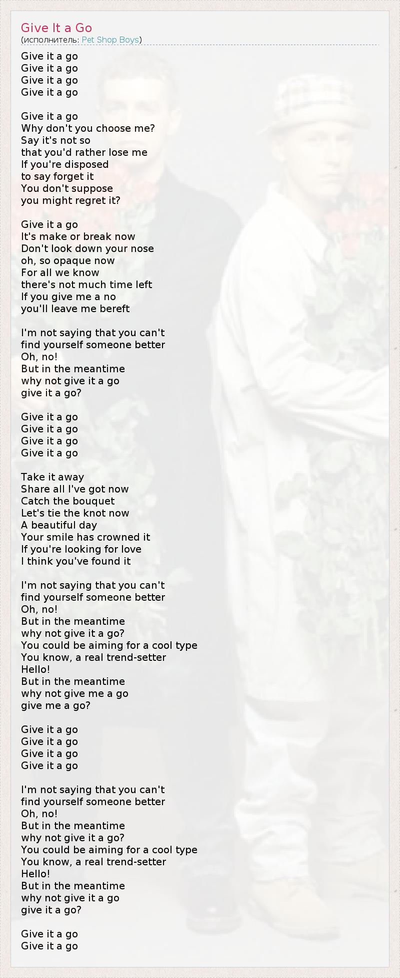 Give it a go Give it a go Give it a go Give it a go Give it a go Why don't you choose me? Say it's not so that you'd rather lose me If you're disposed to say forget it You don't suppose you might regret it? Give it a go It's make or break now Don't look down your nose oh, so opaque now For all we know there's not much time left If you give me a no you'll leave me bereft I'm not saying that you can't find yourself someone better Oh, no! But in the meantime why not give it a go give it a go? Give it a go Give it a go Give it a go Give it a go Take it away Share all I've got now Catch the bouquet Let's tie the knot now A beautiful day Your smile has crowned it If you're looking for love I think you've found it I'm not saying that you can't find yourself someone better Oh, no! But in the meantime why not give it a go? You could be aiming for a cool type You know, a real trend-setter Hello! But in the meantime why not give me a go give me a go? Give it a go Give it a go Give it a go Give it a go I'm not saying that you can't find yourself someone better Oh, no! But in the meantime why not give it a go? You could be aiming for a cool type You know, a real trend-setter Hello! But in the meantime why not give it a go give it a go? Give it a go Give it a go