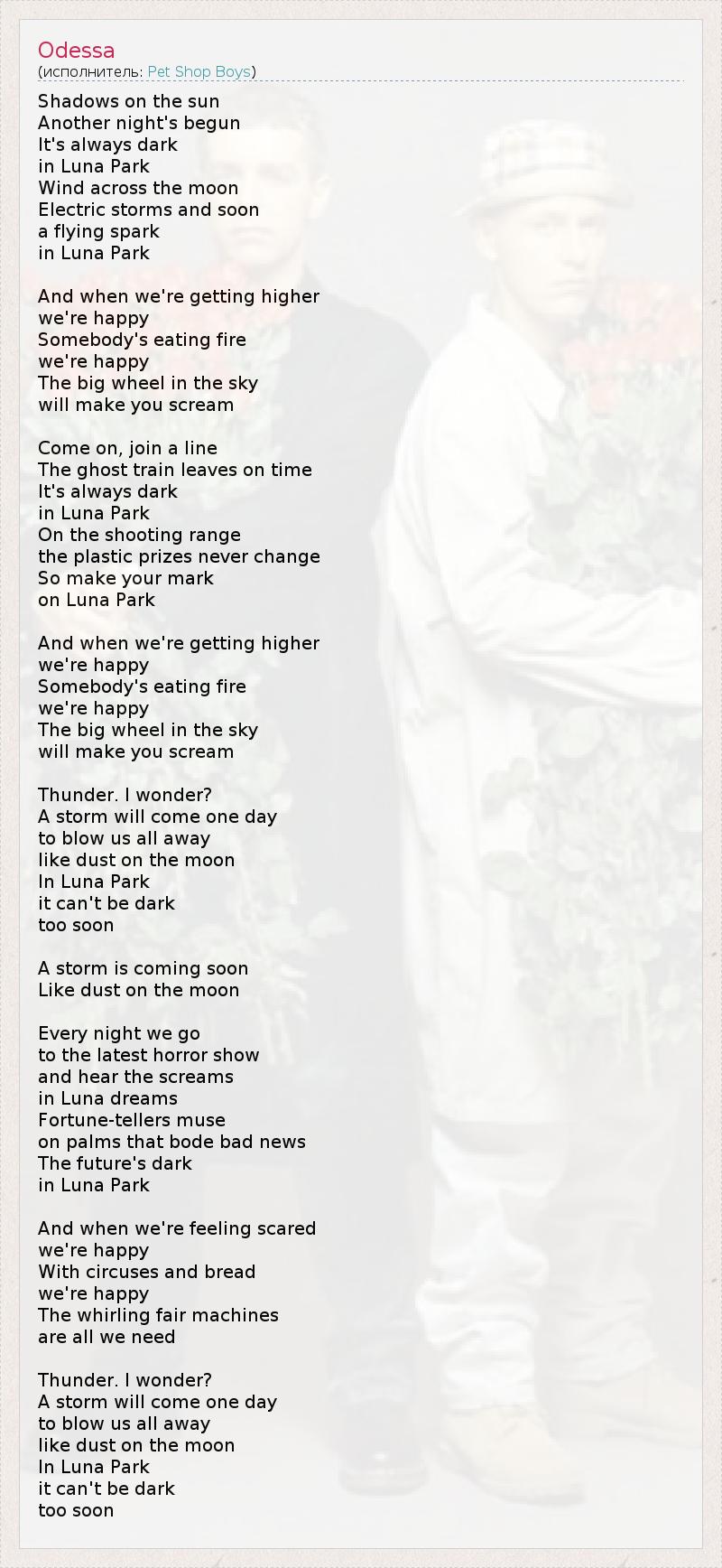 Луна-парк Тени на солнце. Наступил новый вечер. Всегда темно В луна-парке. Ветер по всей луне, Электрические бури и вскоре Летящие искры В луна-парке. И когда мы поднимаемся, Мы счастливы, Кто-то глотает огонь — Мы счастливы. Большое колесо в небе Заставит тебя визжать. Давай, вставай в очередь, Поезд в павильон ужасов Уходит вовремя. Всегда темно В луна-парке. В стрелковом тире Пластмассовые призы Никогда не меняются. Поэтому оставь свой след В Луна-парке. И когда мы поднимаемся, Мы счастливы, Кто-то глотает огонь — Мы счастливы. Большое колесо в небе Заставит тебя визжать. Кажется, гремит гром? Однажды будет буря И унесет нас всех прочь, Как пыль на луне. В луна-парке Не будет темно Очень скоро. Скоро будет буря... Как пыль на луне... Каждый вечер мы идем На последний аттракцион ужасов И слышим визги В кошмарах луна-парка. Гадалки гадают по ладоням, Сулящим плохие новости. Будущее темно В луна-парке. И когда нам страшно, Мы счастливы. Хлебом и зрелищами Мы счастливы. Вертящиеся карусели — Это все, что нам нужно. Кажется, гремит гром? Однажды будет буря И унесет нас всех прочь, Как пыль на луне. В луна-парке Не будет темно Очень скоро. Перевод: Александр