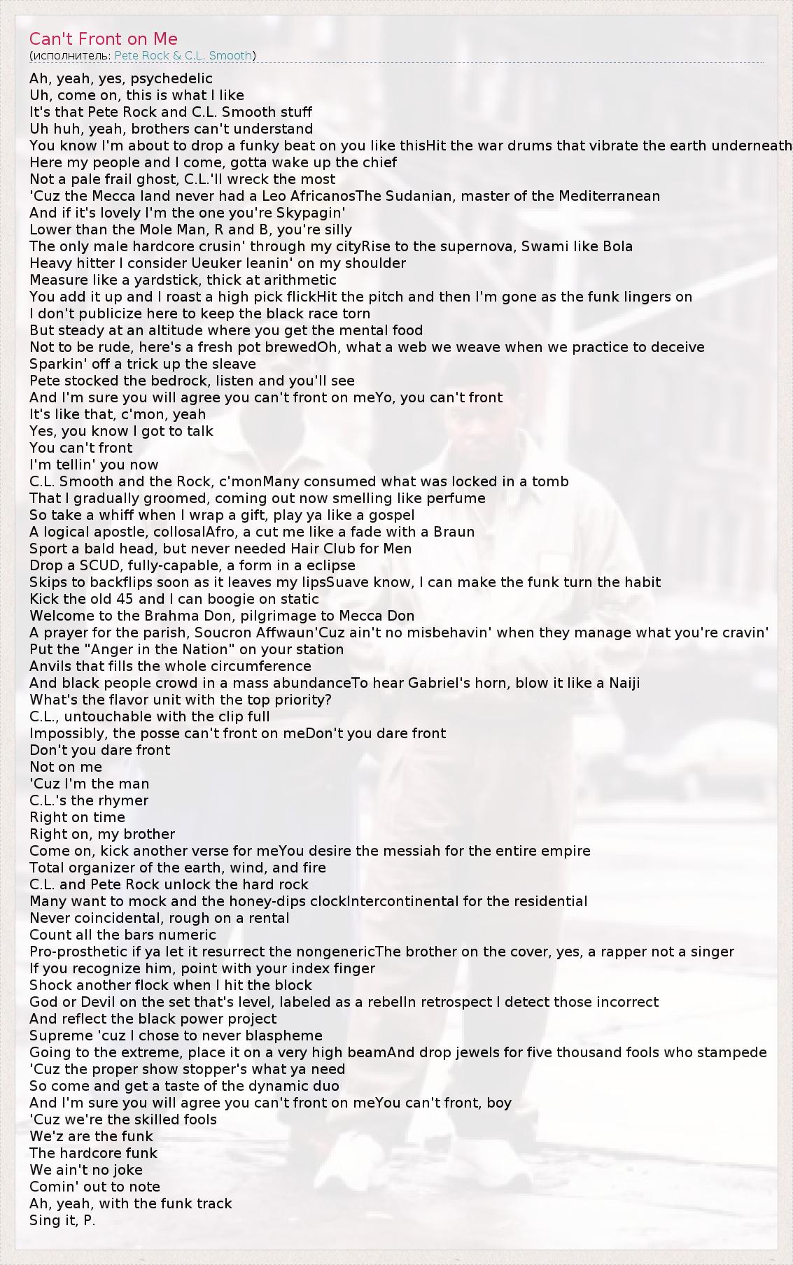 Ah, yeah, yes, psychedelic Uh, come on, this is what I like It's that Pete Rock and C.L. Smooth stuff Uh huh, yeah, brothers can't understand You know I'm about to drop a funky beat on you like thisHit the war drums that vibrate the earth underneath Here my people and I come, gotta wake up the chief Not a pale frail ghost, C.L.'ll wreck the most 'Cuz the Mecca land never had a Leo AfricanosThe Sudanian, master of the Mediterranean And if it's lovely I'm the one you're Skypagin' Lower than the Mole Man, R and B, you're silly The only male hardcore crusin' through my cityRise to the supernova, Swami like Bola Heavy hitter I consider Ueuker leanin' on my shoulder Measure like a yardstick, thick at arithmetic You add it up and I roast a high pick flickHit the pitch and then I'm gone as the funk lingers on I don't publicize here to keep the black race torn But steady at an altitude where you get the mental food Not to be rude, here's a fresh pot brewedOh, what a web we weave when we practice to deceive Sparkin' off a trick up the sleave Pete stocked the bedrock, listen and you'll see And I'm sure you will agree you can't front on meYo, you can't front It's like that, c'mon, yeah Yes, you know I got to talk You can't front I'm tellin' you now C.L. Smooth and the Rock, c'monMany consumed what was locked in a tomb That I gradually groomed, coming out now smelling like perfume So take a whiff when I wrap a gift, play ya like a gospel A logical apostle, collosalAfro, a cut me like a fade with a Braun Sport a bald head, but never needed Hair Club for Men Drop a SCUD, fully-capable, a form in a eclipse Skips to backflips soon as it leaves my lipsSuave know, I can make the funk turn the habit Kick the old 45 and I can boogie on static Welcome to the Brahma Don, pilgrimage to Mecca Don A prayer for the parish, Soucron Affwaun'Cuz ain't no misbehavin' when they manage what you're cravin' Put the "Anger in the Nation" on your station Anvils that fills the whole circumference And black people crowd in a mass abundanceTo hear Gabriel's horn, blow it like a Naiji What's the flavor unit with the top priority? C.L., untouchable with the clip full Impossibly, the posse can't front on meDon't you dare front Don't you dare front Not on me 'Cuz I'm the man C.L.'s the rhymer Right on time Right on, my brother Come on, kick another verse for meYou desire the messiah for the entire empire Total organizer of the earth, wind, and fire C.L. and Pete Rock unlock the hard rock Many want to mock and the honey-dips clockIntercontinental for the residential Never coincidental, rough on a rental Count all the bars numeric Pro-prosthetic if ya let it resurrect the nongenericThe brother on the cover, yes, a rapper not a singer If you recognize him, point with your index finger Shock another flock when I hit the block God or Devil on the set that's level, labeled as a rebelIn retrospect I detect those incorrect And reflect the black power project Supreme 'cuz I chose to never blaspheme Going to the extreme, place it on a very high beamAnd drop jewels for five thousand fools who stampede 'Cuz the proper show stopper's what ya need So come and get a taste of the dynamic duo And I'm sure you will agree you can't front on meYou can't front, boy 'Cuz we're the skilled fools We'z are the funk The hardcore funk We ain't no joke Comin' out to note Ah, yeah, with the funk track Sing it, P.