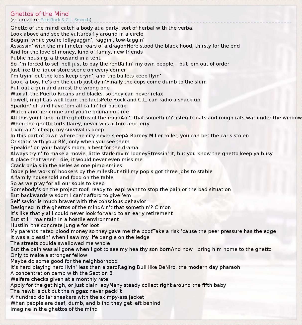Ghetto of the mindI catch a body at a party, sort of herbal with the verbal