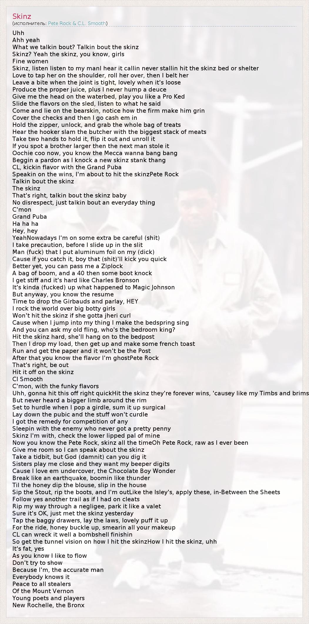 Uhh Ahh yeah What we talkin bout? Talkin bout the skinz Skinz? Yeah the skinz, you know, girls Fine women Skinz, listen listen to my manI hear it callin never stallin hit the skinz bed or shelter Love to tap her on the shoulder, roll her over, then I belt her Leave a bite when the joint is tight, lovely when it's loose Produce the proper juice, plus I never hump a deuce Give me the head on the waterbed, play you like a Pro Ked Slide the flavors on the sled, listen to what he said Come and lie on the bearskin, notice how the firm make him grin Cover the checks and then I go cash em in Hold the zipper, unlock, and grab the whole bag of treats Hear the hooker slam the butcher with the biggest stack of meats Take two hands to hold it, flip it out and unroll it If you spot a brother larger then the next man stole it Oochie coo now, you know the Mecca wanna bang bang Beggin a pardon as I knock a new skinz stank thang CL, kickin flavor with the Grand Puba Speakin on the wins, I'm about to hit the skinzPete Rock Talkin bout the skinz The skinz That's right, talkin bout the skinz baby No disrespect, just talkin bout an everyday thing C'mon Grand Puba Ha ha ha Hey, hey YeahNowadays I'm on some extra be careful (shit) I take precaution, before I slide up in the slit Man (fuck) that I put aluminum foil on my (dick) Cause if you catch it, boy that (shit)'ll kick you quick Better yet, you can pass me a Ziplock A bag of boom, and a 40 then some boot knock I get stiff and it's hard like Charles Bronson It's kinda (fucked) up what happened to Magic Johnson But anyway, you know the resume Time to drop the Girbauds and parlay, HEY I rock the world over big botty girls Won't hit the skinz if she gotta jheri curl Cause when I jump into my thing I make the bedspring sing And you can ask my old fling, who's the bedroom king? Hit the skinz hard, she'll hang on to the bedpost Then I drop my load, then get up and make some french toast Run and get the paper and it won't be the Post After that you know the flavor I'm ghostPete Rock That's right, be out Hit it off on the skinz Cl Smooth C'mon, with the funky flavors Uhh, gonna hit this off right quickHit the skinz they're forever wins, 'causey like my Timbs and brims But never heard a bigger limb around the rim Set to hurdle when I pop a girdle, sum it up surgical Lay down the pubic and the stuff won't curdle I got the remedy for competition of any Sleepin with the enemy who never got a pretty penny Skinz I'm with, check the lower lipped pal of mine Now you know the Pete Rock, skinz all the timeOh Pete Rock, raw as I ever been Give me room so I can speak about the skinz Take a tidbit, but God (damnit) can you dig it Sisters play me close and they want my beeper digits Cause I love em undercover, the Chocolate Boy Wonder Break like an earthquake, boomin like thunder Til the honey dip the blouse, slip in the house Sip the Stout, rip the boots, and I'm outLike the Isley's, apply these, in-Between the Sheets Follow yes another trail as if I had on cleats Rip my way through a negligee, park it like a valet Sure it's OK, just met the skinz yesterday Tap the baggy drawers, lay the laws, lovely puff it up For the ride, honey buckle up, smearin all your makeup CL can wreck it well a bombshell finishin So get the tunnel vision on how I hit the skinzHow I hit the skinz, uhh It's fat, yes As you know I like to flow Don't try to show Because I'm, the accurate man Everybody knows it Peace to all stealers Of the Mount Vernon Young poets and players New Rochelle, the Bronx