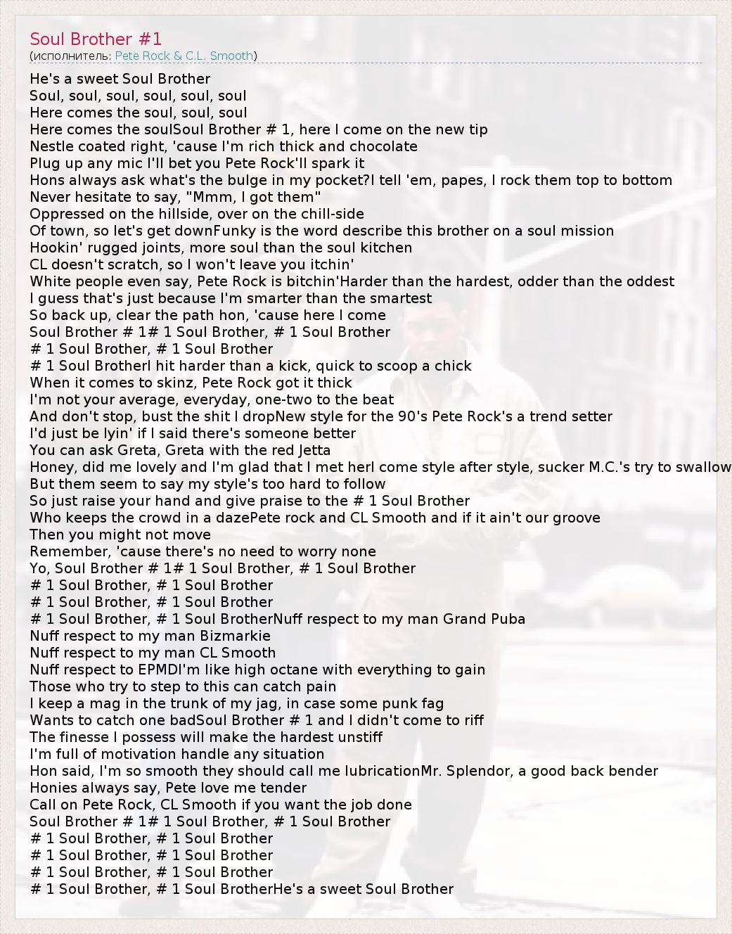 He's a sweet Soul Brother Soul, soul, soul, soul, soul, soul Here comes the soul, soul, soul Here comes the soulSoul Brother # 1, here I come on the new tip Nestle coated right, 'cause I'm rich thick and chocolate Plug up any mic I'll bet you Pete Rock'll spark it Hons always ask what's the bulge in my pocket?I tell 'em, papes, I rock them top to bottom Never hesitate to say, "Mmm, I got them" Oppressed on the hillside, over on the chill-side Of town, so let's get downFunky is the word describe this brother on a soul mission Hookin' rugged joints, more soul than the soul kitchen CL doesn't scratch, so I won't leave you itchin' White people even say, Pete Rock is bitchin'Harder than the hardest, odder than the oddest I guess that's just because I'm smarter than the smartest So back up, clear the path hon, 'cause here I come Soul Brother # 1# 1 Soul Brother, # 1 Soul Brother # 1 Soul Brother, # 1 Soul Brother # 1 Soul BrotherI hit harder than a kick, quick to scoop a chick When it comes to skinz, Pete Rock got it thick I'm not your average, everyday, one-two to the beat And don't stop, bust the shit I dropNew style for the 90's Pete Rock's a trend setter I'd just be lyin' if I said there's someone better You can ask Greta, Greta with the red Jetta Honey, did me lovely and I'm glad that I met herI come style after style, sucker M.C.'s try to swallow But them seem to say my style's too hard to follow So just raise your hand and give praise to the # 1 Soul Brother Who keeps the crowd in a dazePete rock and CL Smooth and if it ain't our groove Then you might not move Remember, 'cause there's no need to worry none Yo, Soul Brother # 1# 1 Soul Brother, # 1 Soul Brother # 1 Soul Brother, # 1 Soul Brother # 1 Soul Brother, # 1 Soul Brother # 1 Soul Brother, # 1 Soul BrotherNuff respect to my man Grand Puba Nuff respect to my man Bizmarkie Nuff respect to my man CL Smooth Nuff respect to EPMDI'm like high octane with everything to gain Those who try to step to this can catch pain I keep a mag in the trunk of my jag, in case some punk fag Wants to catch one badSoul Brother # 1 and I didn't come to riff The finesse I possess will make the hardest unstiff I'm full of motivation handle any situation Hon said, I'm so smooth they should call me lubricationMr. Splendor, a good back bender Honies always say, Pete love me tender Call on Pete Rock, CL Smooth if you want the job done Soul Brother # 1# 1 Soul Brother, # 1 Soul Brother # 1 Soul Brother, # 1 Soul Brother # 1 Soul Brother, # 1 Soul Brother # 1 Soul Brother, # 1 Soul Brother # 1 Soul Brother, # 1 Soul BrotherHe's a sweet Soul Brother