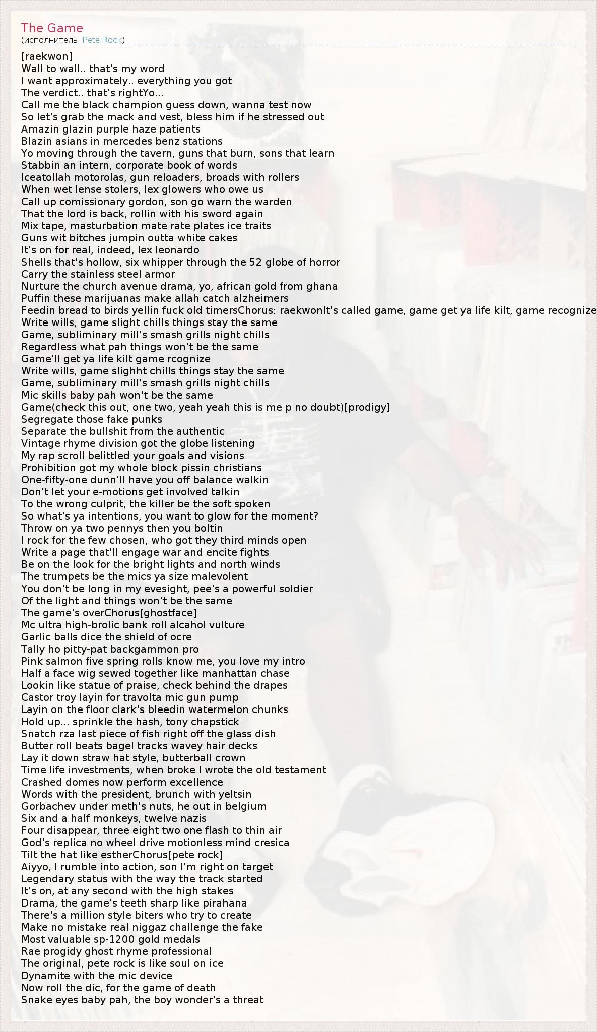 Feedin bread to birds yellin fuck old timersChorus: raekwonIt's called game, game get ya life kilt, game recognize