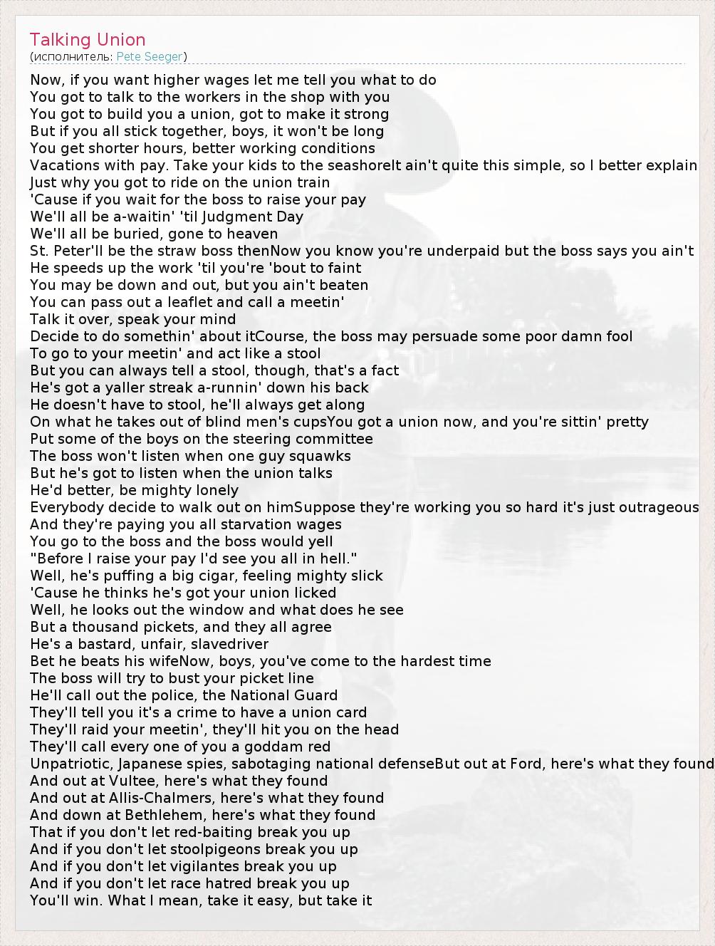 А как ты думаешь, о чем песня "Talking Union" ?