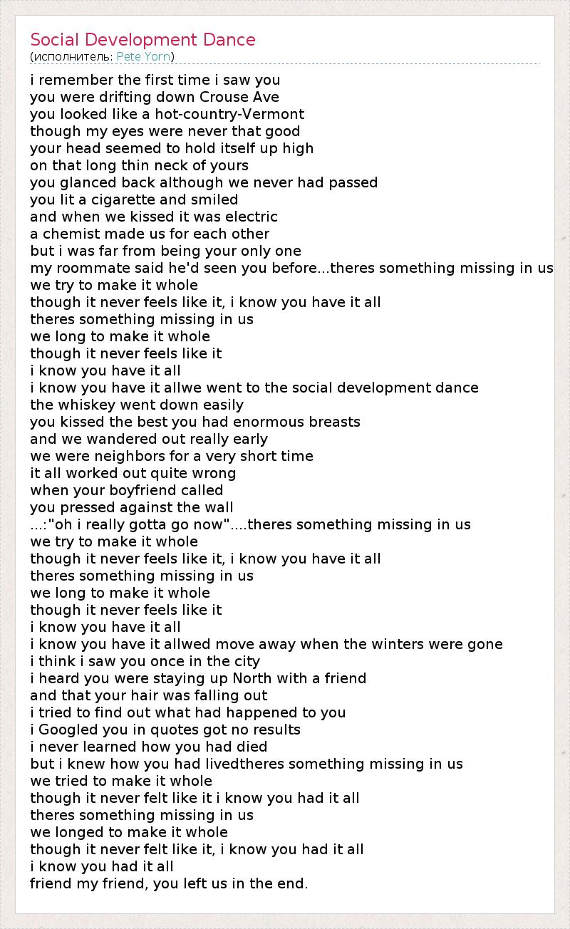 i remember the first time i saw you you were drifting down Crouse Ave you looked like a hot-country-Vermont though my eyes were never that good your head seemed to hold itself up high on that long thin neck of yours you glanced back although we never had passed you lit a cigarette and smiled and when we kissed it was electric a chemist made us for each other but i was far from being your only one my roommate said he'd seen you before...theres something missing in us we try to make it whole though it never feels like it, i know you have it all theres something missing in us we long to make it whole though it never feels like it i know you have it all i know you have it allwe went to the social development dance the whiskey went down easily you kissed the best you had enormous breasts and we wandered out really early we were neighbors for a very short time it all worked out quite wrong when your boyfriend called you pressed against the wall ...:"oh i really gotta go now"....theres something missing in us we try to make it whole though it never feels like it, i know you have it all theres something missing in us we long to make it whole though it never feels like it i know you have it all i know you have it allwed move away when the winters were gone i think i saw you once in the city i heard you were staying up North with a friend and that your hair was falling out i tried to find out what had happened to you i Googled you in quotes got no results i never learned how you had died but i knew how you had livedtheres something missing in us we tried to make it whole though it never felt like it i know you had it all theres something missing in us we longed to make it whole though it never felt like it, i know you had it all i know you had it all friend my friend, you left us in the end.