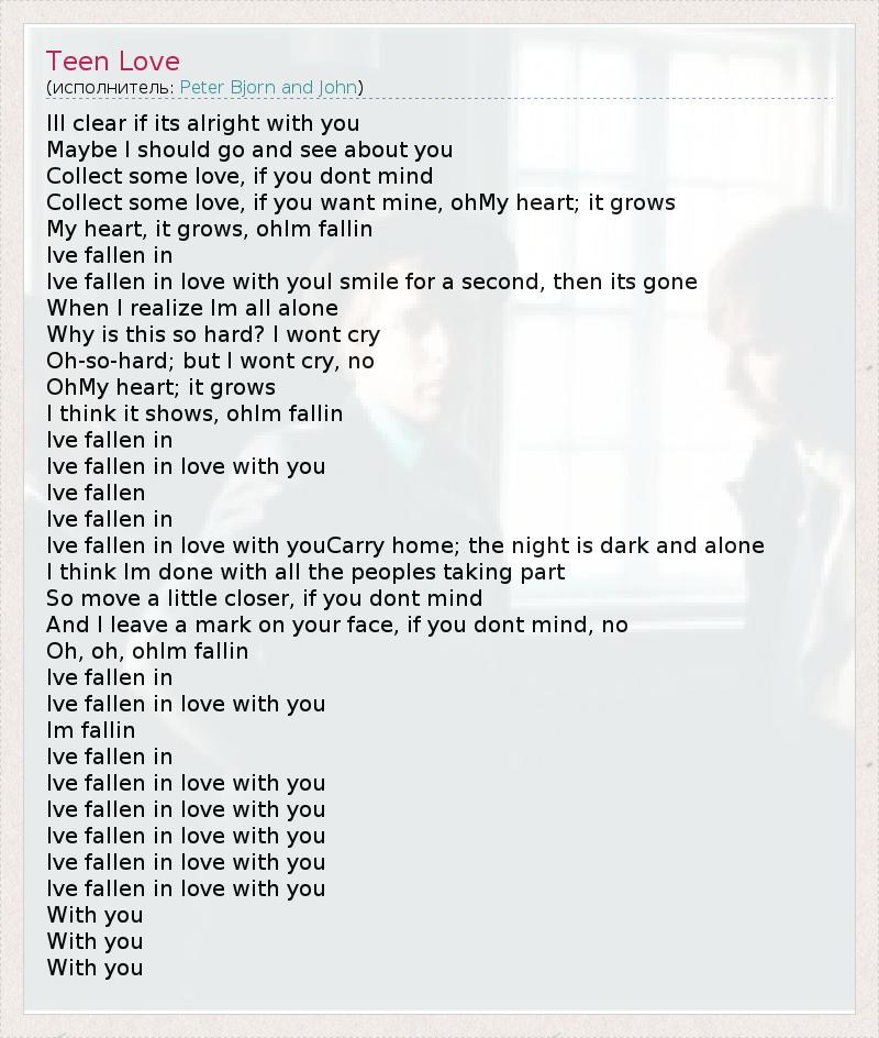 Ill clear if its alright with you Maybe I should go and see about you Collect some love, if you dont mind Collect some love, if you want mine, ohMy heart; it grows My heart, it grows, ohIm fallin Ive fallen in Ive fallen in love with youI smile for a second, then its gone When I realize Im all alone Why is this so hard? I wont cry Oh-so-hard; but I wont cry, no OhMy heart; it grows I think it shows, ohIm fallin Ive fallen in Ive fallen in love with you Ive fallen Ive fallen in Ive fallen in love with youCarry home; the night is dark and alone I think Im done with all the peoples taking part So move a little closer, if you dont mind And I leave a mark on your face, if you dont mind, no Oh, oh, ohIm fallin Ive fallen in Ive fallen in love with you Im fallin Ive fallen in Ive fallen in love with you Ive fallen in love with you Ive fallen in love with you Ive fallen in love with you Ive fallen in love with you With you With you With you