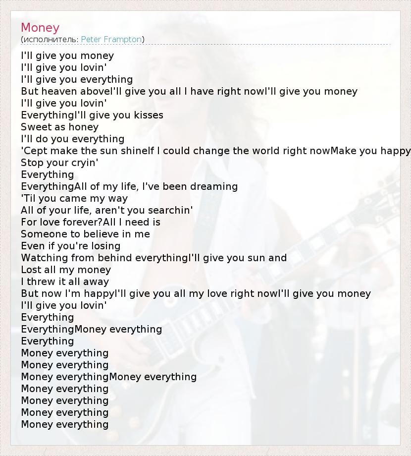 But now I'm happyI'll give you all my love right nowI'll give you money
