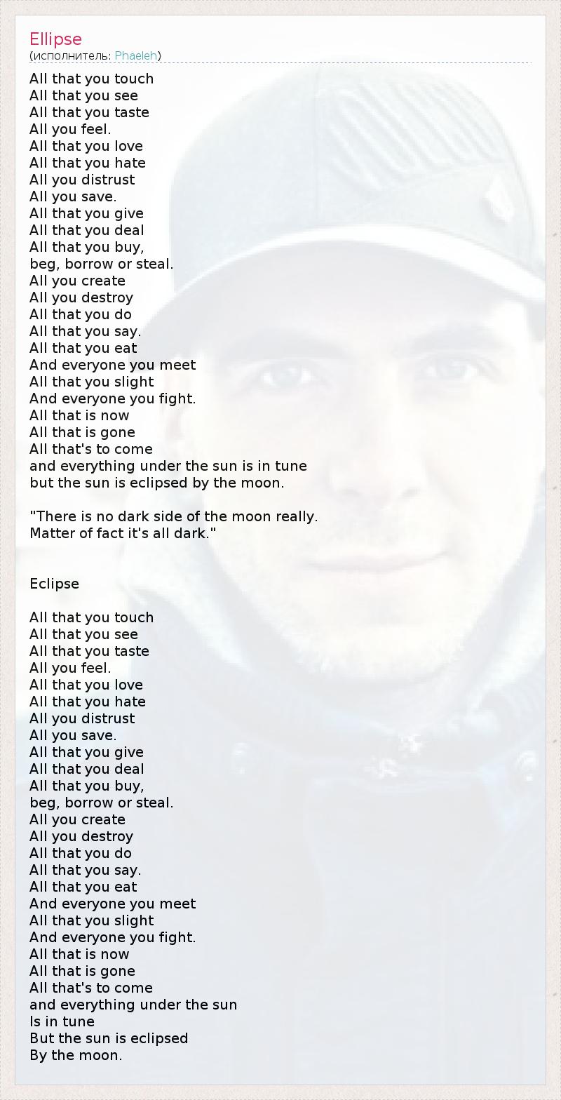 Это интересно:Phaeleh (произносится как Фелла) aka Matt Preston - дабстеп продюсер, диджей с внушительной коллекцией винила и меломан, музыкальные вкусы которого формировались на музыке The Prodigy, Tool, Plaid, Aphex Twin, Boards of Canada, LTJ Bukem и др. из Бристоля (Великобритания). Имеет релизы на Urban Scrumping, Disfigured Dubz, Wheel & Deal, Soul Motive, Box Clever, OpenEarz, Formant, Slime, Against the Grain, Afterglo, Surface Tension. В октябре 2010г. вышел дебютный альбом - «Fallen Light» на Afterglo.На... продолжение