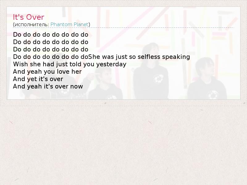 Это интересно:Phantom Planet – группа из Южной Калифорнии, относится к альтернативному року. Группа более широко известна по треку "California", который был создан для популярного молодёжного сериала "The O.C.".Группа существует с 1994 года по наши дни, дебютный альбом появился 1997 году (Phantom Planet is Missing), в 2002 году вышел второй их альбом (The Guest), который принес наибольший успех благодаря песне "California".... продолжение