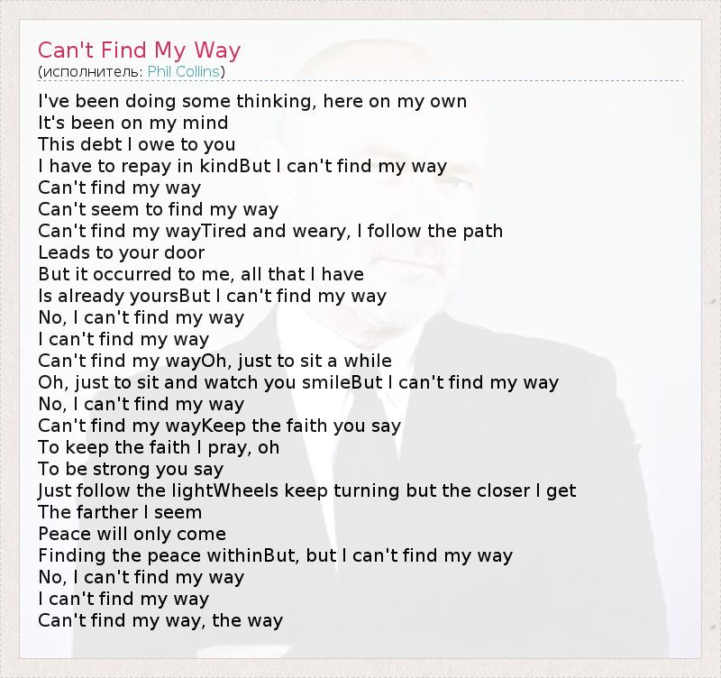 I've been doing some thinking, here on my own It's been on my mind This debt I owe to you I have to repay in kindBut I can't find my way Can't find my way Can't seem to find my way Can't find my wayTired and weary, I follow the path Leads to your door But it occurred to me, all that I have Is already yoursBut I can't find my way No, I can't find my way I can't find my way Can't find my wayOh, just to sit a while Oh, just to sit and watch you smileBut I can't find my way No, I can't find my way Can't find my wayKeep the faith you say To keep the faith I pray, oh To be strong you say Just follow the lightWheels keep turning but the closer I get The farther I seem Peace will only come Finding the peace withinBut, but I can't find my way No, I can't find my way I can't find my way Can't find my way, the way