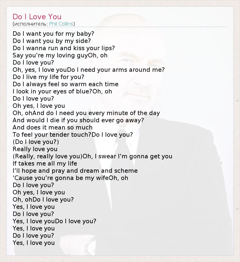 Do I want you for my baby? Do I want you by my side? Do I wanna run and kiss your lips? Say you're my loving guyOh, oh Do I love you? Oh, yes, I love youDo I need your arms around me? Do I live my life for you? Do I always feel so warm each time I look in your eyes of blue?Oh, oh Do I love you? Oh yes, I love you Oh, ohAnd do I need you every minute of the day And would I die if you should ever go away? And does it mean so much To feel your tender touch?Do I love you? (Do I love you?) Really love you (Really, really love you)Oh, I swear I'm gonna get you If takes me all my life I'll hope and pray and dream and scheme 'Cause you're gonna be my wifeOh, oh Do I love you? Oh yes, I love you Oh, ohDo I love you? Yes, I love you Do I love you? Yes, I love youDo I love you? Yes, I love you Do I love you? Yes, I love you
