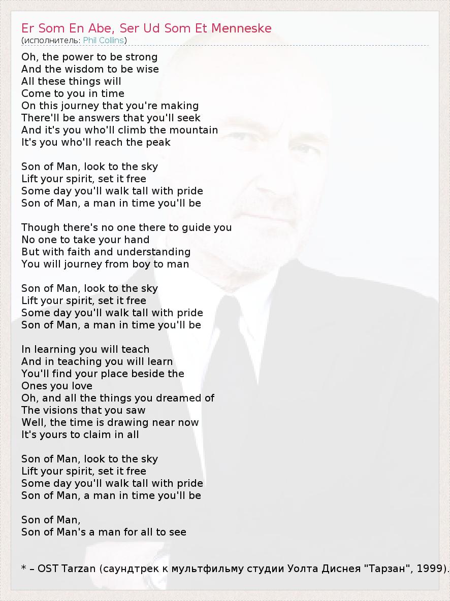 Oh, the power to be strong And the wisdom to be wise All these things will Come to you in time On this journey that you're making There'll be answers that you'll seek And it's you who'll climb the mountain It's you who'll reach the peak Son of Man, look to the sky Lift your spirit, set it free Some day you'll walk tall with pride Son of Man, a man in time you'll be Though there's no one there to guide you No one to take your hand But with faith and understanding You will journey from boy to man Son of Man, look to the sky Lift your spirit, set it free Some day you'll walk tall with pride Son of Man, a man in time you'll be In learning you will teach And in teaching you will learn You'll find your place beside the Ones you love Oh, and all the things you dreamed of The visions that you saw Well, the time is drawing near now It's yours to claim in all Son of Man, look to the sky Lift your spirit, set it free Some day you'll walk tall with pride Son of Man, a man in time you'll be Son of Man, Son of Man's a man for all to see * – OST Tarzan (саундтрек к мультфильму студии Уолта Диснея "Тарзан", 1999).