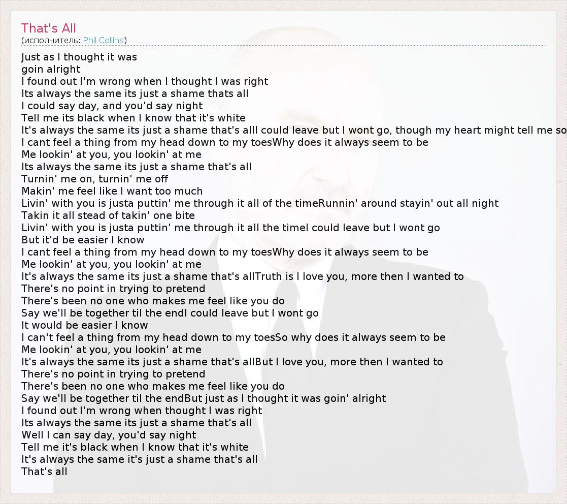 Это интересно:Фил Коллинз (Phil Collins; полн. имя Филипп Дэвид Чарльз Коллинз (Philip David Charles Collins); р. 30 января 1951, Лондон) — ударник и певец в жанре рок и поп. Кроме того - композитор, актёр, продюсер, лидер биг-бэнда. Среди его наград — 7 «Грэмми» и «Оскар».Фил Коллинз сотрудничал с такими известными музыкантами, как Джордж Харрисон, Пол Маккартни, Роберт Плант, Эрик Клэптон, Майк Олдфилд, Стинг, Джон Кэйл, Брайан... продолжение