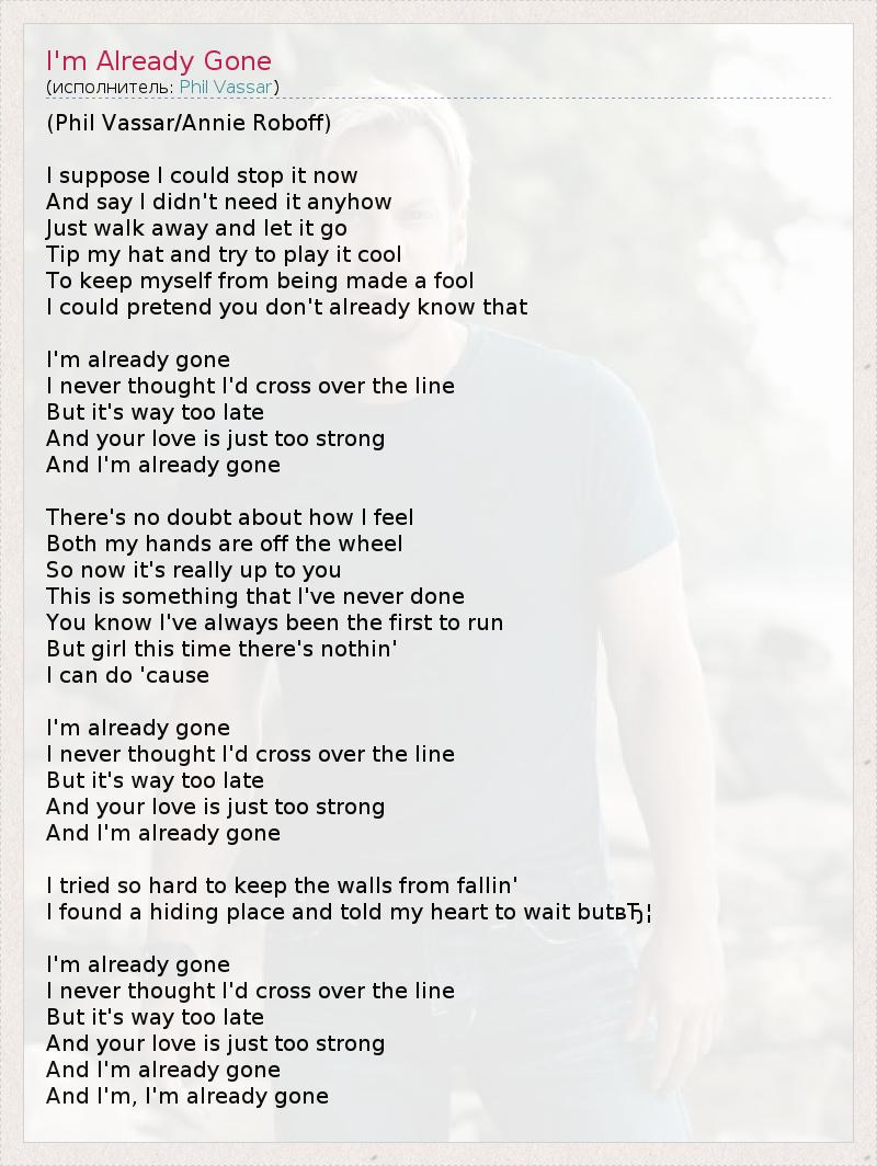 (Phil Vassar/Annie Roboff) I suppose I could stop it now And say I didn't need it anyhow Just walk away and let it go Tip my hat and try to play it cool To keep myself from being made a fool I could pretend you don't already know that I'm already gone I never thought I'd cross over the line But it's way too late And your love is just too strong And I'm already gone There's no doubt about how I feel Both my hands are off the wheel So now it's really up to you This is something that I've never done You know I've always been the first to run But girl this time there's nothin' I can do 'cause I'm already gone I never thought I'd cross over the line But it's way too late And your love is just too strong And I'm already gone I tried so hard to keep the walls from fallin' I found a hiding place and told my heart to wait but… I'm already gone I never thought I'd cross over the line But it's way too late And your love is just too strong And I'm already gone And I'm, I'm already gone
