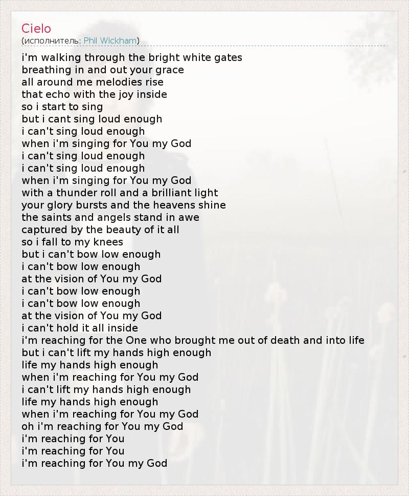 i'm walking through the bright white gates breathing in and out your grace all around me melodies rise that echo with the joy inside so i start to sing but i cant sing loud enough i can't sing loud enough when i'm singing for You my God i can't sing loud enough i can't sing loud enough when i'm singing for You my God with a thunder roll and a brilliant light your glory bursts and the heavens shine the saints and angels stand in awe captured by the beauty of it all so i fall to my knees but i can't bow low enough i can't bow low enough at the vision of You my God i can't bow low enough i can't bow low enough at the vision of You my God i can't hold it all inside i'm reaching for the One who brought me out of death and into life but i can't lift my hands high enough life my hands high enough when i'm reaching for You my God i can't lift my hands high enough life my hands high enough when i'm reaching for You my God oh i'm reaching for You my God i'm reaching for You i'm reaching for You i'm reaching for You my God