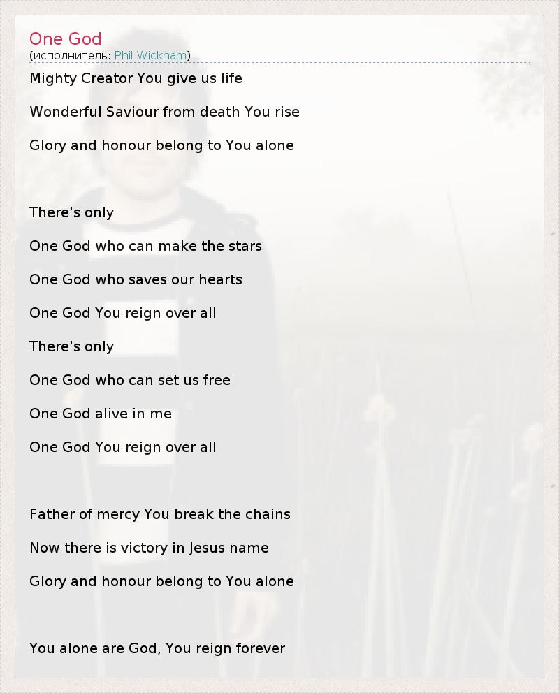 Mighty Creator You give us life Wonderful Saviour from death You rise Glory and honour belong to You alone There's only One God who can make the stars One God who saves our hearts One God You reign over all There's only One God who can set us free One God alive in me One God You reign over all Father of mercy You break the chains Now there is victory in Jesus name Glory and honour belong to You alone You alone are God, You reign forever