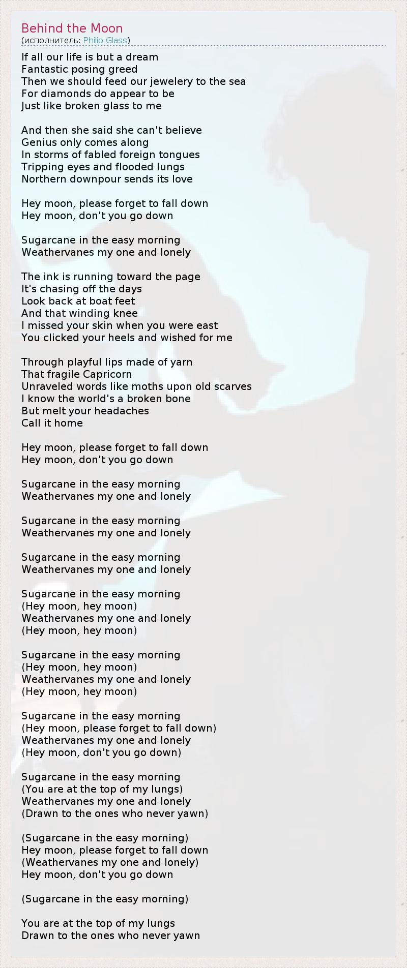 Если вся наша жизнь - это лишь сон, Причудливый сон о жадности, Тогда мы должны скормить наши драгоценности морю, Ведь бриллианты для меня на самом деле Лишь разбитое стекло... А потом она сказала, что не может поверить в то, Что гении всегда приходят, Выкрикивая что-то на выдуманных иностранных языках, С блуждающими глазами, с полными воды легкими... Северный ливень посылает свою любовь.... Хей, луна, пожалуйста, забудь уйти. Хей, луна, не уходи. Сахарный тростник спокойным утром Укажет, где моя единственная и одинокая... Чернила текут по направлению к странице, Прогоняя прочь ушедшие дни... Вспоминая твои ступни в туфлях-лодочках И изгибы твоей ноги, Я скучал по твоей коже, пока ты была на востоке. Ты стукнула каблуком о каблук и пожелала меня... Игривые губы рассказали байку О хрупком Козероге. Разгаданные слова, как моль на старом шарфе... Я знаю, что мир - это сломанный скелет. Но прогони свою головную боль, Назови его домом.... Хей, луна, пожалуйста, забудь уйти. Хей, луна, не уходи. Сахарный тростник спокойным утром Укажет, где моя единственная и одинокая... Сахарный тростник спокойным утром Укажет, где моя единственная и одинокая... Сахарный тростник спокойным утром Укажет, где моя единственная и одинокая... Сахарный тростник спокойным утром (Хей, луна!) Укажет, где моя единственная и одинокая... (Хей, луна!) Сахарный тростник спокойным утром (Хей, луна!) Укажет, где моя единственная и одинокая... (Хей, луна!) Сахарный тростник спокойным утром (Хей, луна!) Укажет, где моя единственная и одинокая... (Хей, луна!) Сахарный тростник спокойным утром (Хей, луна!) Укажет, где моя единственная и одинокая... (Хей, луна!) Сахарный тростник спокойным утром (Хей, луна!) Укажет, где моя единственная и одинокая... (Хей, луна!) (Сахарный тростник спокойным утром...) Я вот-вот выкрикну твоё имя, Но меня притягивают те, кому я на фиг не нужен...