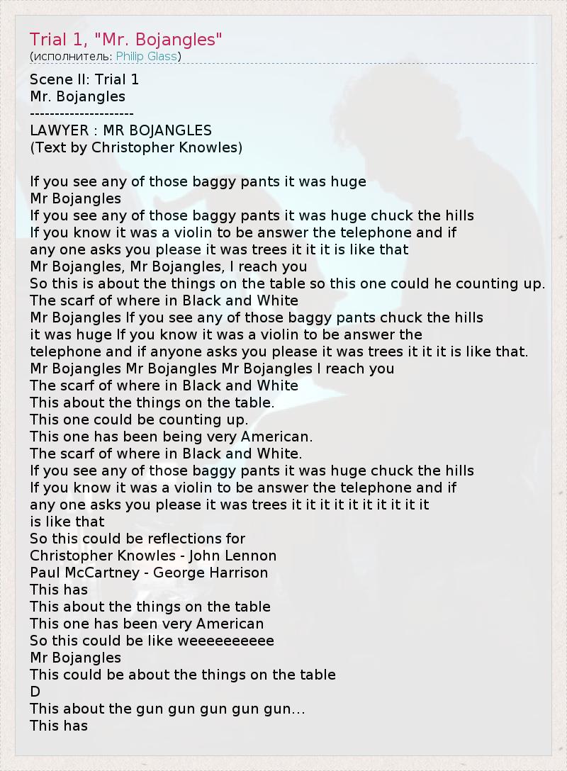 ГлавнаяИсполнителиPhilip GlassTrial 1, "Mr. Bojangles"