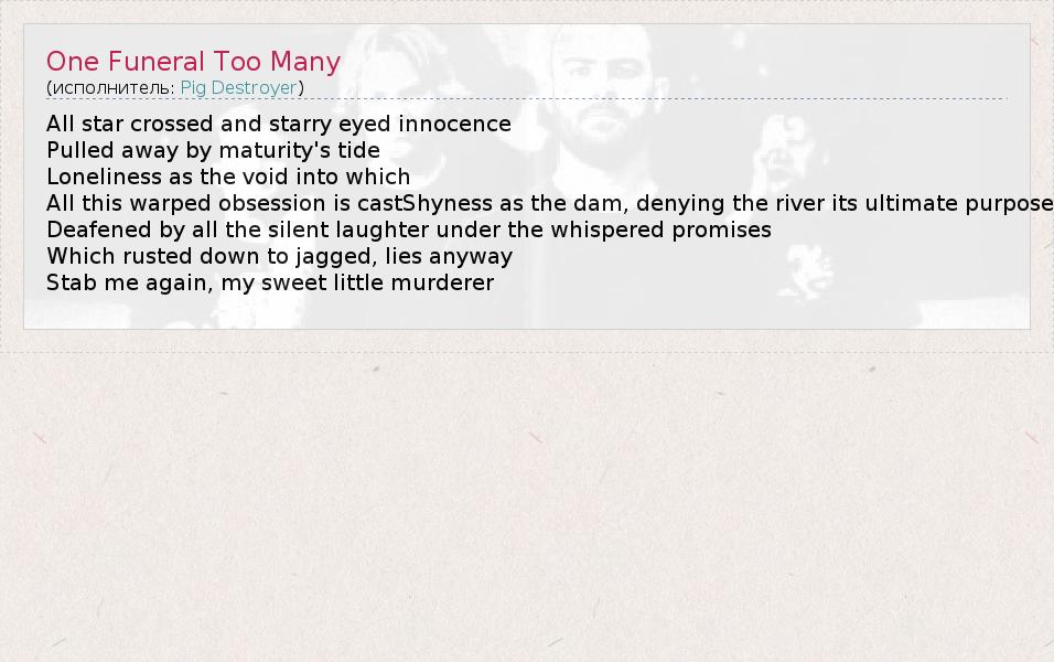 А как ты думаешь, о чем песня "One Funeral Too Many" ?