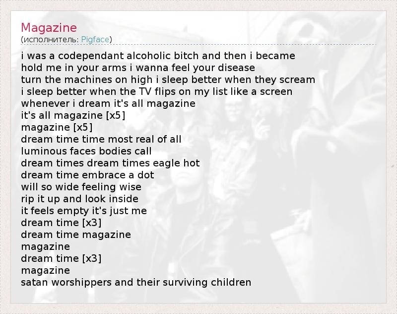 i was a codependant alcoholic bitch and then i became hold me in your arms i wanna feel your disease turn the machines on high i sleep better when they scream i sleep better when the TV flips on my list like a screen whenever i dream it's all magazine it's all magazine [x5] magazine [x5] dream time time most real of all luminous faces bodies call dream times dream times eagle hot dream time embrace a dot will so wide feeling wise rip it up and look inside it feels empty it's just me dream time [x3] dream time magazine magazine dream time [x3] magazine satan worshippers and their surviving children