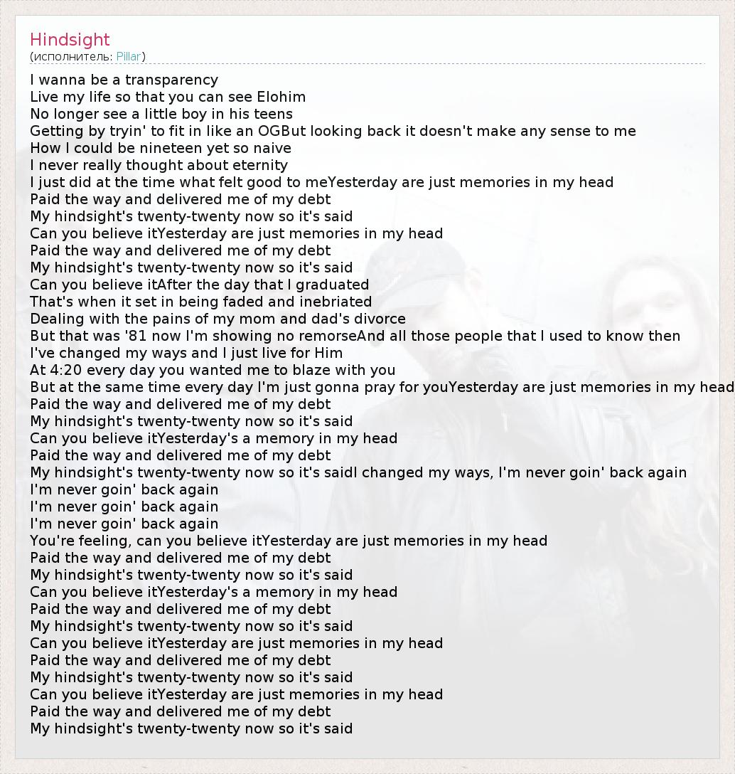 But at the same time every day I'm just gonna pray for youYesterday are just memories in my head