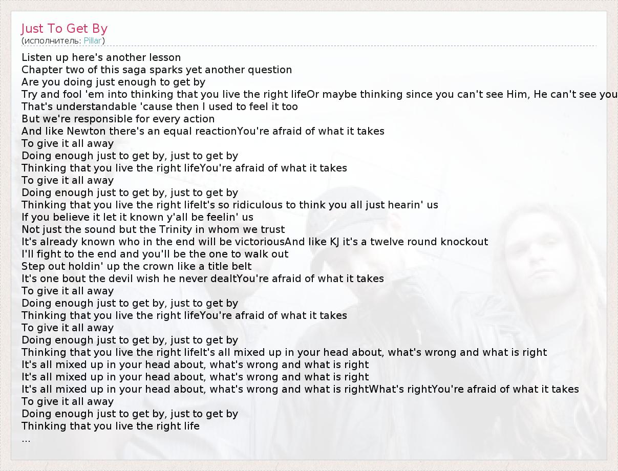 Listen up here's another lesson Chapter two of this saga sparks yet another question Are you doing just enough to get by Try and fool 'em into thinking that you live the right lifeOr maybe thinking since you can't see Him, He can't see you That's understandable 'cause then I used to feel it too But we're responsible for every action And like Newton there's an equal reactionYou're afraid of what it takes To give it all away Doing enough just to get by, just to get by Thinking that you live the right lifeYou're afraid of what it takes To give it all away Doing enough just to get by, just to get by Thinking that you live the right lifeIt's so ridiculous to think you all just hearin' us If you believe it let it known y'all be feelin' us Not just the sound but the Trinity in whom we trust It's already known who in the end will be victoriousAnd like KJ it's a twelve round knockout I'll fight to the end and you'll be the one to walk out Step out holdin' up the crown like a title belt It's one bout the devil wish he never dealtYou're afraid of what it takes To give it all away Doing enough just to get by, just to get by Thinking that you live the right lifeYou're afraid of what it takes To give it all away Doing enough just to get by, just to get by Thinking that you live the right lifeIt's all mixed up in your head about, what's wrong and what is right It's all mixed up in your head about, what's wrong and what is right It's all mixed up in your head about, what's wrong and what is right It's all mixed up in your head about, what's wrong and what is rightWhat's rightYou're afraid of what it takes To give it all away Doing enough just to get by, just to get by Thinking that you live the right life ...