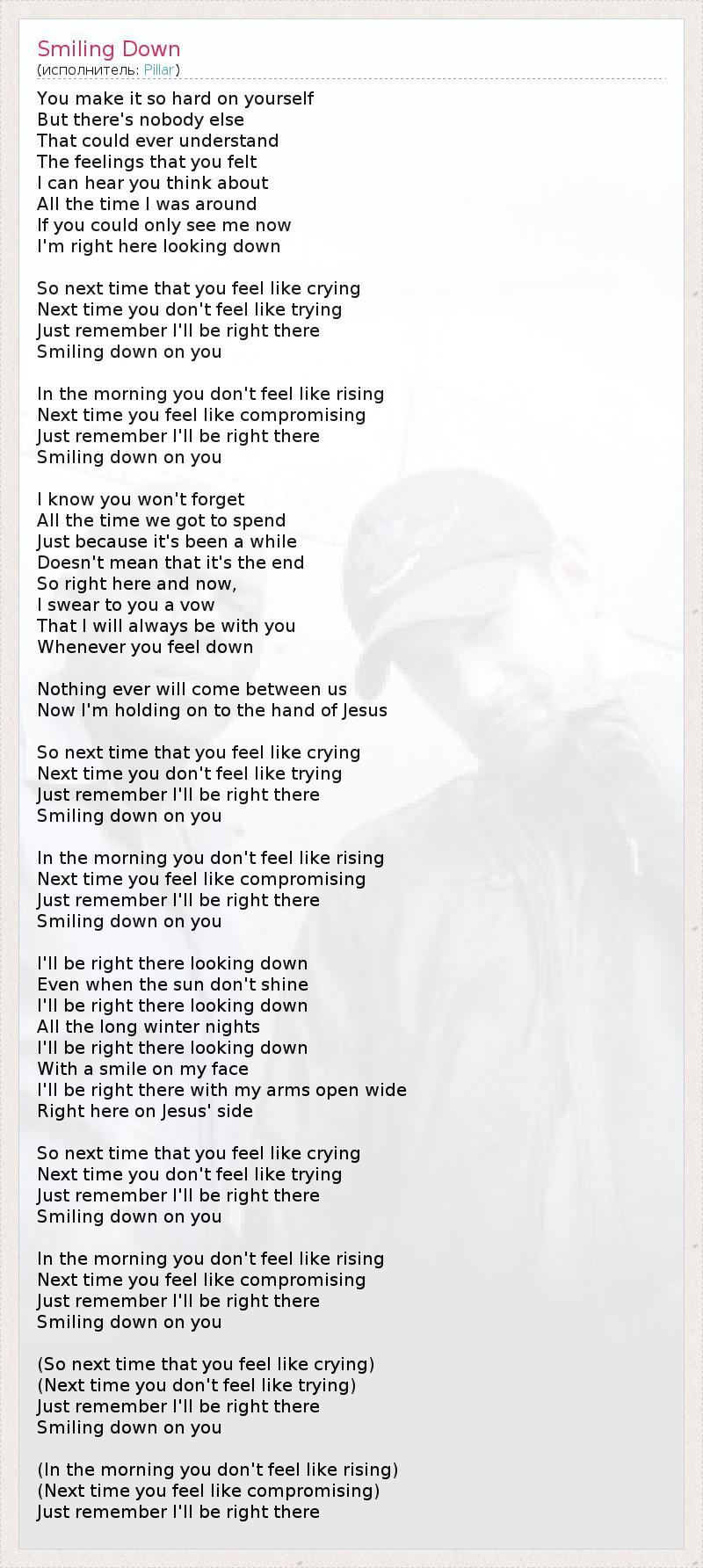 You make it so hard on yourself But there's nobody else That could ever understand The feelings that you felt I can hear you think about All the time I was around If you could only see me now I'm right here looking down So next time that you feel like crying Next time you don't feel like trying Just remember I'll be right there Smiling down on you In the morning you don't feel like rising Next time you feel like compromising Just remember I'll be right there Smiling down on you I know you won't forget All the time we got to spend Just because it's been a while Doesn't mean that it's the end So right here and now, I swear to you a vow That I will always be with you Whenever you feel down Nothing ever will come between us Now I'm holding on to the hand of Jesus So next time that you feel like crying Next time you don't feel like trying Just remember I'll be right there Smiling down on you In the morning you don't feel like rising Next time you feel like compromising Just remember I'll be right there Smiling down on you I'll be right there looking down Even when the sun don't shine I'll be right there looking down All the long winter nights I'll be right there looking down With a smile on my face I'll be right there with my arms open wide Right here on Jesus' side So next time that you feel like crying Next time you don't feel like trying Just remember I'll be right there Smiling down on you In the morning you don't feel like rising Next time you feel like compromising Just remember I'll be right there Smiling down on you (So next time that you feel like crying) (Next time you don't feel like trying) Just remember I'll be right there Smiling down on you (In the morning you don't feel like rising) (Next time you feel like compromising) Just remember I'll be right there