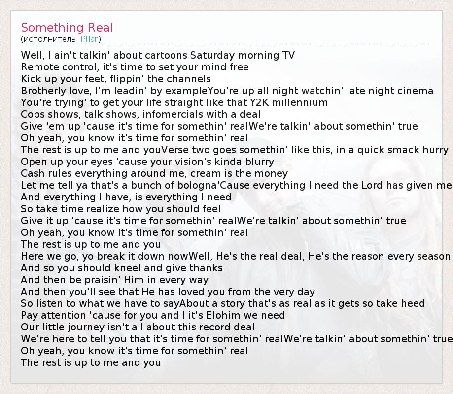 Give it up 'cause it's time for somethin' realWe're talkin' about somethin' true