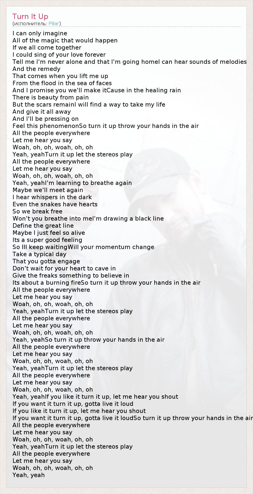 I can only imagine All of the magic that would happen If we all come together I could sing of your love forever Tell me I'm never alone and that I'm going homeI can hear sounds of melodies And the remedy That comes when you lift me up From the flood in the sea of faces And I promise you we'll make itCause in the healing rain There is beauty from pain But the scars remainI will find a way to take my life And give it all away And I'll be pressing on Feel this phenomenonSo turn it up throw your hands in the air All the people everywhere Let me hear you say Woah, oh, oh, woah, oh, oh Yeah, yeahTurn it up let the stereos play All the people everywhere Let me hear you say Woah, oh, oh, woah, oh, oh Yeah, yeahI'm learning to breathe again Maybe we'll meet again I hear whispers in the dark Even the snakes have hearts So we break free Won't you breathe into meI'm drawing a black line Define the great line Maybe I just feel so alive Its a super good feeling So Ill keep waitingWill your momentum change Take a typical day That you gotta engage Don't wait for your heart to cave in Give the freaks something to believe in Its about a burning fireSo turn it up throw your hands in the air All the people everywhere Let me hear you say Woah, oh, oh, woah, oh, oh Yeah, yeahTurn it up let the stereos play All the people everywhere Let me hear you say Woah, oh, oh, woah, oh, oh Yeah, yeahSo turn it up throw your hands in the air All the people everywhere Let me hear you say Woah, oh, oh, woah, oh, oh Yeah, yeahTurn it up let the stereos play All the people everywhere Let me hear you say Woah, oh, oh, woah, oh, oh Yeah, yeahIf you like it turn it up, let me hear you shout If you want it turn it up, gotta live it loud If you like it turn it up, let me hear you shout If you want it turn it up, gotta live it loudSo turn it up throw your hands in the air All the people everywhere Let me hear you say Woah, oh, oh, woah, oh, oh Yeah, yeahTurn it up let the stereos play All the people everywhere Let me hear you say Woah, oh, oh, woah, oh, oh Yeah, yeah