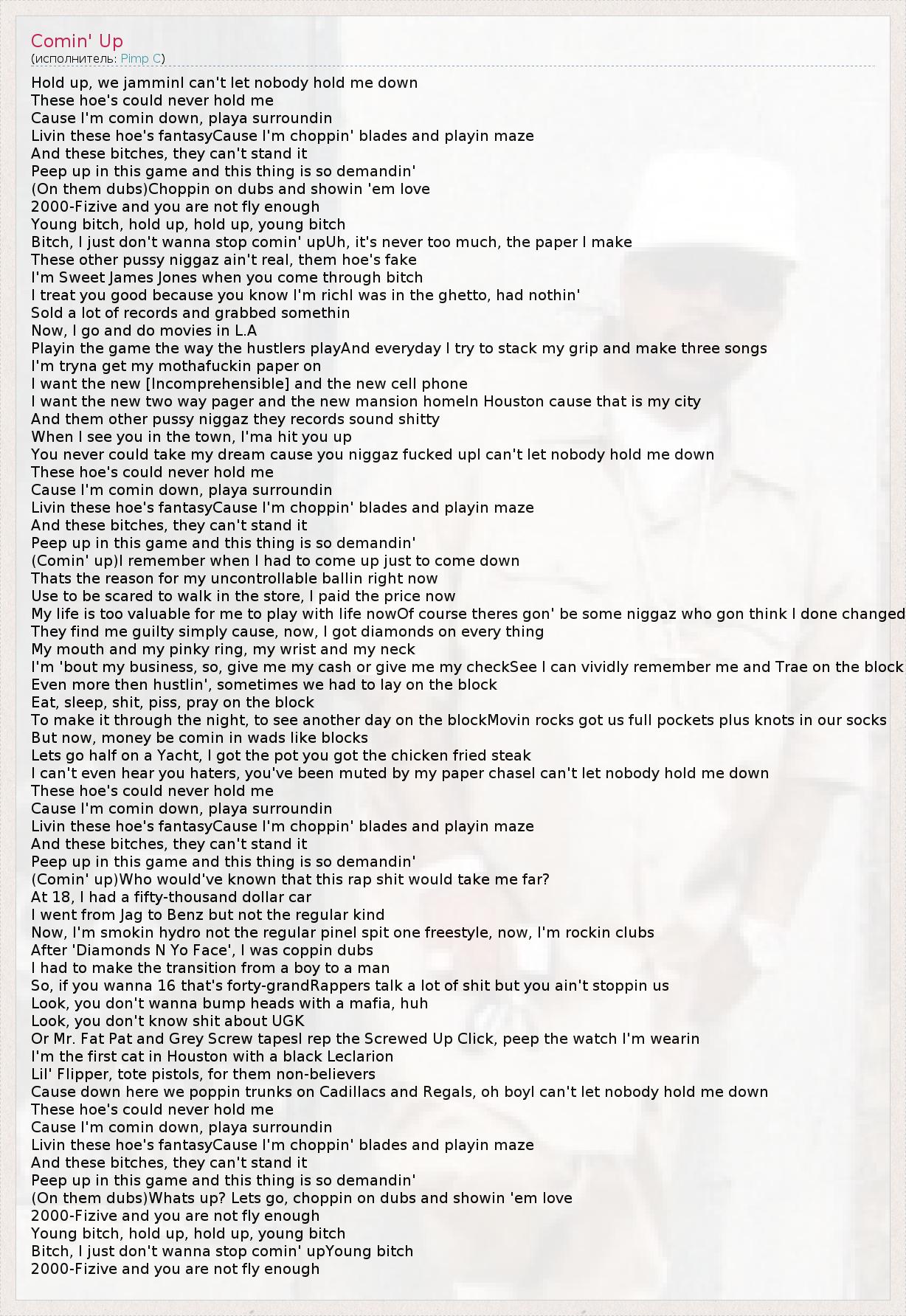 Это интересно:Pimp C - известный рэппер/продюсер и одна вторая дуэта UGK. Как продюсер повлиял на творчество многих исполнителей. Такие лица, как David Banner, Three 6 Mafia, Field Mob, T.I., YoungBloodZ признают, что этот парень оказал на их дальнейшее творчество немалое влияние. Детство Pimp C было трудным. Как и многие другие провинциальные районы в 80х, Port Arthur попал в «эпидемию» крэка, и это перевернуло мирный город-порт вверх дном.... продолжение