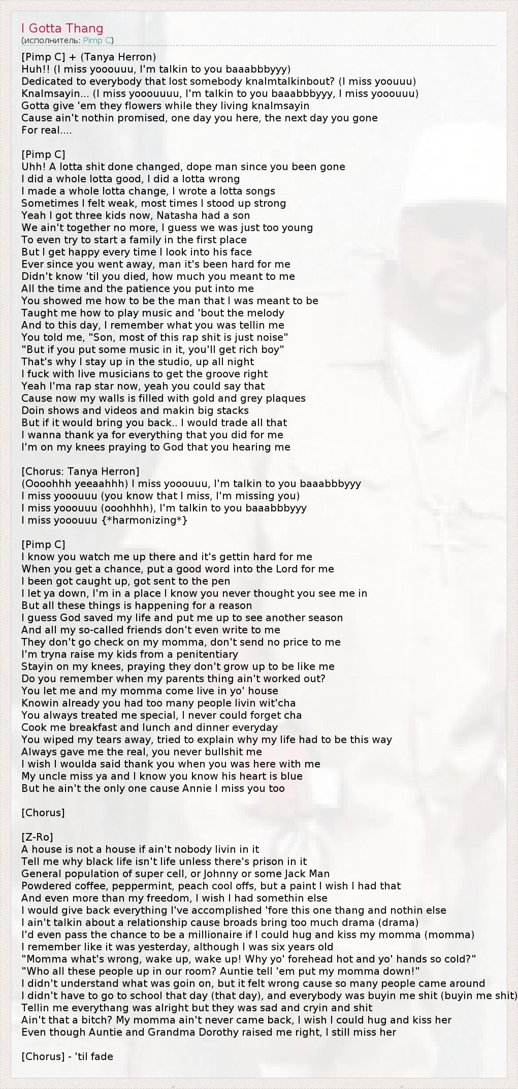Это интересно:Pimp C - известный рэппер/продюсер и одна вторая дуэта UGK. Как продюсер повлиял на творчество многих исполнителей. Такие лица, как David Banner, Three 6 Mafia, Field Mob, T.I., YoungBloodZ признают, что этот парень оказал на их дальнейшее творчество немалое влияние. Детство Pimp C было трудным. Как и многие другие провинциальные районы в 80х, Port Arthur попал в «эпидемию» крэка, и это перевернуло мирный город-порт вверх дном.... продолжение