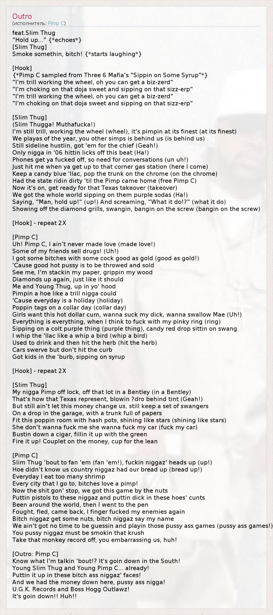 {*Pimp C sampled from Three 6 Mafia's "Sippin on Some Syrup"*}