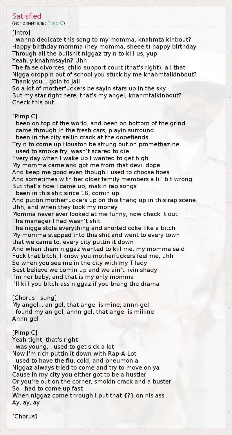 Это интересно:Pimp C - известный рэппер/продюсер и одна вторая дуэта UGK. Как продюсер повлиял на творчество многих исполнителей. Такие лица, как David Banner, Three 6 Mafia, Field Mob, T.I., YoungBloodZ признают, что этот парень оказал на их дальнейшее творчество немалое влияние. Детство Pimp C было трудным. Как и многие другие провинциальные районы в 80х, Port Arthur попал в «эпидемию» крэка, и это перевернуло мирный город-порт вверх дном.... продолжение