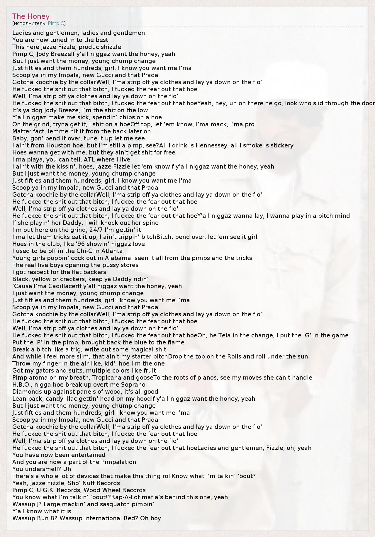 Ladies and gentlemen, ladies and gentlemen You are now tuned in to the best This here Jazze Fizzle, produc shizzle Pimp C, Jody BreezeIf y'all niggaz want the honey, yeah But I just want the money, young chump change Just fifties and them hundreds, girl, I know you want me I'ma Scoop ya in my Impala, new Gucci and that Prada Gotcha koochie by the collarWell, I'ma strip off ya clothes and lay ya down on the flo' He fucked the shit out that bitch, I fucked the fear out that hoe Well, I'ma strip off ya clothes and lay ya down on the flo' He fucked the shit out that bitch, I fucked the fear out that hoeYeah, hey, uh oh there he go, look who slid through the door It's ya dog Jody Breeze, I'm the shit on the low Y'all niggaz make me sick, spendin' chips on a hoe On the grind, tryna get it, I shit on a hoeOff top, let 'em know, I'ma mack, I'ma pro Matter fact, lemme hit it from the back later on Baby, gon' bend it over, tune it up let me see I ain't from Houston hoe, but I'm still a pimp, see?All I drink is Hennessey, all I smoke is stickery Hoes wanna get with me, but they ain't get shit for free I'ma playa, you can tell, ATL where I live I ain't with the kissin', hoes, Jazze Fizzle let 'em knowIf y'all niggaz want the honey, yeah But I just want the money, young chump change Just fifties and them hundreds, girl, I know you want me I'ma Scoop ya in my Impala, new Gucci and that Prada Gotcha koochie by the collarWell, I'ma strip off ya clothes and lay ya down on the flo' He fucked the shit out that bitch, I fucked the fear out that hoe Well, I'ma strip off ya clothes and lay ya down on the flo' He fucked the shit out that bitch, I fucked the fear out that hoeY'all niggaz wanna lay, I wanna play in a bitch mind If she playin' her Daddy, I will knock out her spine I'm out here on the grind, 24/7 I'm gettin' it I'ma let them tricks eat it up, I ain't trippin' bitchBitch, bend over, let 'em see it girl Hoes in the club, like '96 showin' niggaz love I used to be off in the Chi-C in Atlanta Young girls poppin' cock out in AlabamaI seen it all from the pimps and the tricks The real live boys opening the pussy stores I got respect for the flat backers Black, yellow or crackers, keep ya Daddy ridin' 'Cause I'ma CadillacerIf y'all niggaz want the honey, yeah I just want the money, young chump change Just fifties and them hundreds, girl I know you want me I'ma Scoop ya in my Impala, new Gucci and that Prada Gotcha koochie by the collarWell, I'ma strip off ya clothes and lay ya down on the flo' He fucked the shit out that bitch, I fucked the fear out that hoe Well, I'ma strip off ya clothes and lay ya down on the flo' He fucked the shit out that bitch, I fucked the fear out that hoeOh, he Tela in the change, I put the 'G' in the game Put the 'P' in the pimp, brought back the blue to the flame Break a bitch like a trig, write out some magical shit And while I feel more slim, that ain't my starter bitchDrop the top on the Rolls and roll under the sun Throw my finger in the air like, kid', hoe I'm the one Got my gators and suits, multiple colors like fruit Pimp aroma on my breath, Tropicana and gooseTo the roots of pianos, see my moves she can't handle H.B.O., nigga hoe break up overtime Soprano Diamonds up against panels of wood, it's all good Lean back, candy 'llac gettin' head on my hoodIf y'all niggaz want the honey, yeah But I just want the money, young chump change Just fifties and them hundreds, girl I know you want me I'ma Scoop ya in my Impala, new Gucci and that Prada Gotcha koochie by the collarWell, I'ma strip off ya clothes and lay ya down on the flo' He fucked the shit out that bitch, I fucked the fear out that hoe Well, I'ma strip off ya clothes and lay ya down on the flo' He fucked the shit out that bitch, I fucked the fear out that hoeLadies and gentlemen, Fizzle, oh, yeah You have now been entertained And you are now a part of the Pimpalation You undersmell? Uh There's a whole lot of devices that make this thing rollKnow what I'm talkin' 'bout? Yeah, Jazze Fizzle, Sho' Nuff Records Pimp C, U.G.K. Records, Wood Wheel Records You know what I'm talkin' 'bout!?Rap-A-Lot mafia's behind this one, yeah Wassup J? Large mackin' and sasquatch pimpin' Y'all know what it is Wassup Bun B? Wassup International Red? Oh boy