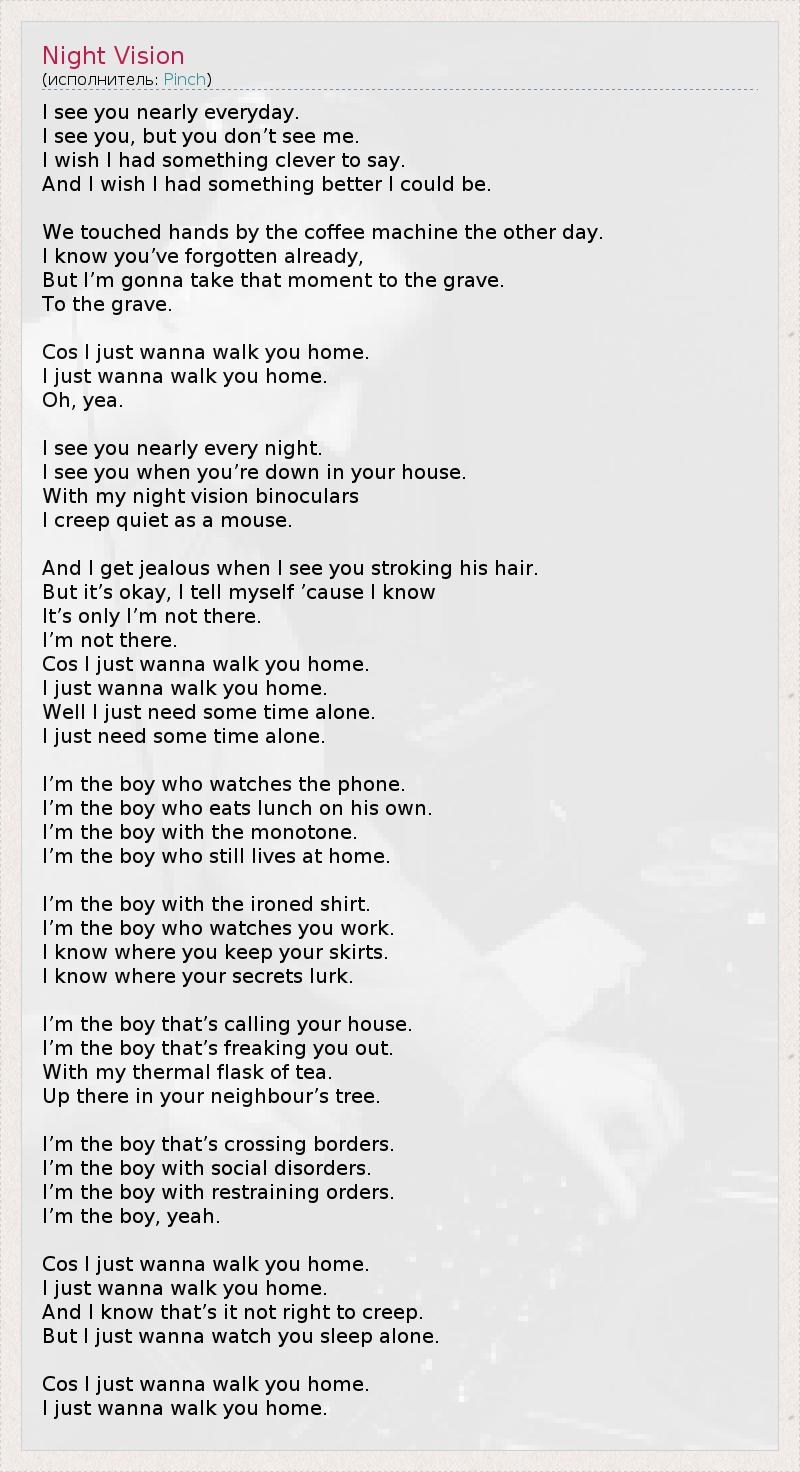 I see you nearly everyday. I see you, but you don’t see me. I wish I had something clever to say. And I wish I had something better I could be. We touched hands by the coffee machine the other day. I know you’ve forgotten already, But I’m gonna take that moment to the grave. To the grave. Cos I just wanna walk you home. I just wanna walk you home. Oh, yea. I see you nearly every night. I see you when you’re down in your house. With my night vision binoculars I creep quiet as a mouse. And I get jealous when I see you stroking his hair. But it’s okay, I tell myself ’cause I know It’s only I’m not there. I’m not there. Cos I just wanna walk you home. I just wanna walk you home. Well I just need some time alone. I just need some time alone. I’m the boy who watches the phone. I’m the boy who eats lunch on his own. I’m the boy with the monotone. I’m the boy who still lives at home. I’m the boy with the ironed shirt. I’m the boy who watches you work. I know where you keep your skirts. I know where your secrets lurk. I’m the boy that’s calling your house. I’m the boy that’s freaking you out. With my thermal flask of tea. Up there in your neighbour’s tree. I’m the boy that’s crossing borders. I’m the boy with social disorders. I’m the boy with restraining orders. I’m the boy, yeah. Cos I just wanna walk you home. I just wanna walk you home. And I know that’s it not right to creep. But I just wanna watch you sleep alone. Cos I just wanna walk you home. I just wanna walk you home.