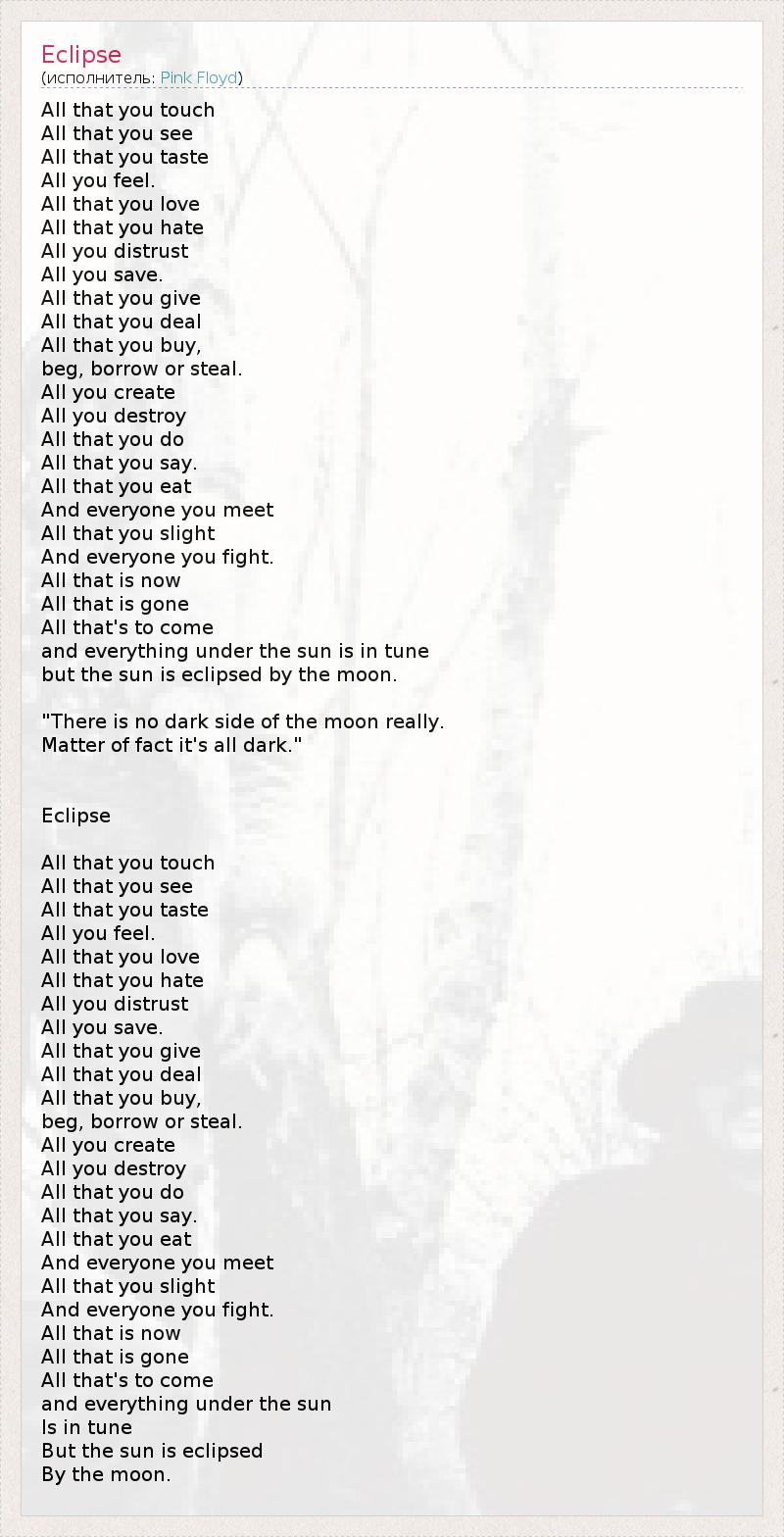 Песня-подведение итогов. Всё, чего вы касаетесь, что вы чувствуете, любите и ненавидите, что вы едите, что создаёте и разрушаете — всё это должно освещать Солнце, но оно затемнено Луной. Без этой солнечной энергии жизнь на Земле сводит с ума, лицевая сторона Луны холодная, но та, что повёрнута к Солнцу — там самая жизнь, там можно скрыться от земных кошмаров и жить счастливо… Но эти мечты разрушает прагматичный голос в самом конце композиции под стук сердца: «There is no dark side of the Moon really, matter of fact its all dark» (На самом деле нет никакой тёмной стороны Луны, в реальности она вся тёмная). Многие цитаты из альбома были сказаны известными людьми, эти же слова, ставшие легендарными, произнёс уборщик студии Джерри О’Дрисколл.