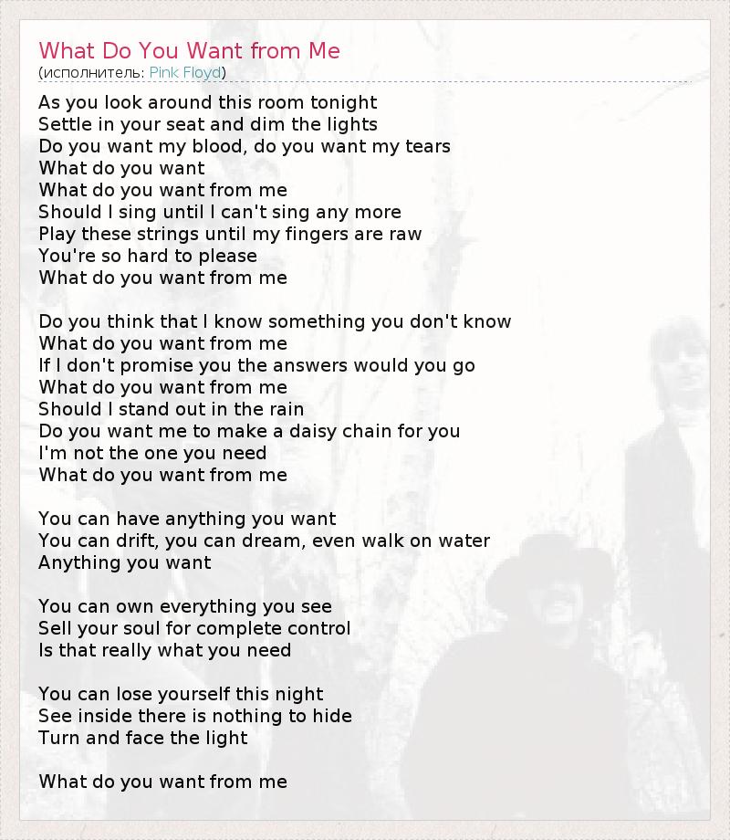 What Do You Want From Me? была написана в соавторстве с Полли Сэмсон. «Большая часть слов явилась результатом нашего с Полли сотрудничества… — объясняет Гилмор, — а некоторые появились в моменты утраты взаимопонимания между нами. В название вынесены именно такие слова».